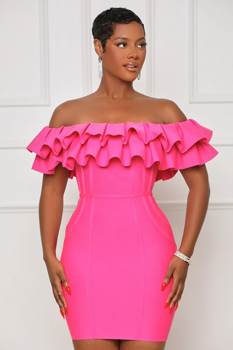 This Bubble-Yum Off Shoulder Bandage Dress will add style and glamour to your wardrobe. This sophisticated dress is hot pink in color and has a back zipper for easy wear. Its off shoulder design ensures a flattering and comfortable fit. Step out in style in this dress!