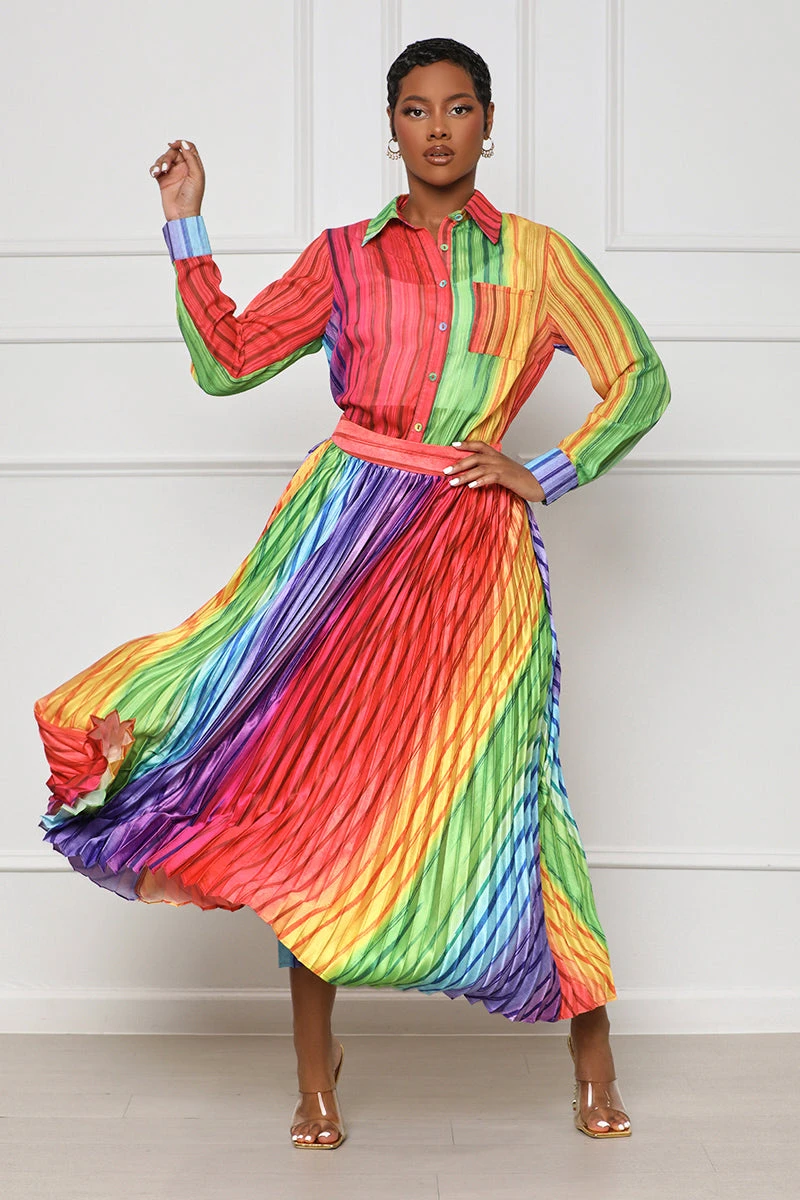Our Button Down Watercolor Skirt Set is made to be your new favorite. The vibrant striped watercolor print adds a stylish touch to this set. The top features long sleeves and a collard neckline, while the matching skirt has a relaxed fit with a back zipper closure. This casual yet elegant look can be styled with heels or flats for your next brunch with friends.