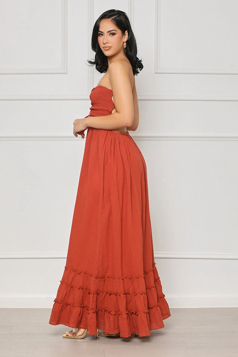 Our Cant Compare Strapless Maxi Dress is the perfect blend of style and comfort. Featuring backless detailing, a textured design, a drawstring feature, and layered ruffle detailing at the hem, this dress adds an extra bit of flair to any look. Made with lightweight fabric for a relaxed fit, you’ll stay chic and comfortable all day long.