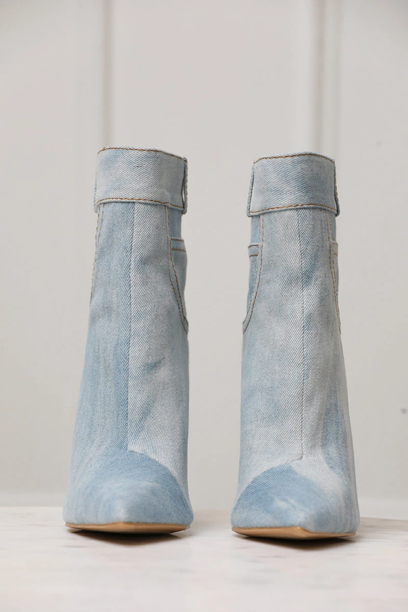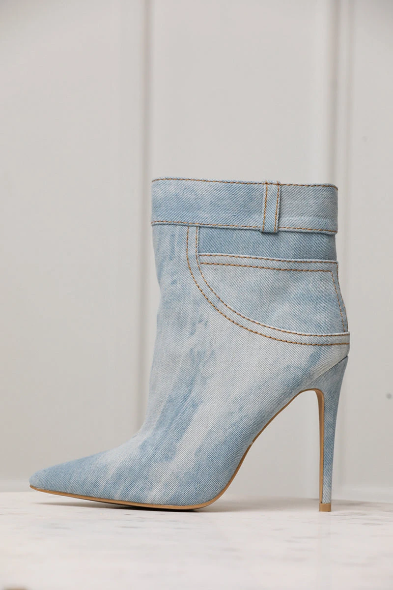 Dress up your favorite denim look with our slip-on Canva Denim Booties. Designed to resemble a blue jean pant, these booties feature a pointed toe and stiletto heel that lend elegance to an otherwise casual shoe. Made from soft denim fabric, these versatile boots are perfect for everyday wear!