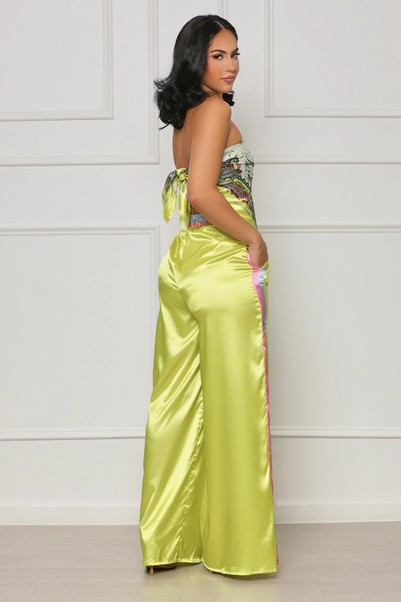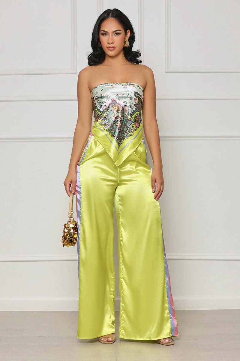 Make an unforgettable entrance with the exclusive Caught Your Attention set, featuring a scarf top and matching pants with drawstring detailing and an abstract print. Crafted from premium materials, this statement piece is sure to elevate any ensemble when styled with a pair of heels and a favorite bag. Feel sophisticated and stylish on your next holiday, or elevate Sunday comfort with this luxurious set.