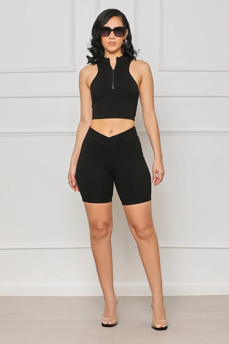Make a statement in the Contour Ribbed Zip Up Shorts Set. Featuring a ribbed material and stylish zipper detailing on the top, this set will have you looking on trend with its high neckline and fashion-forward design. Perfect for days on the go, from the airport to a fun date, this set will keep you stylish no matter the occasion. Easily pair with heels or flats and a cross-body for a chic yet casual look.