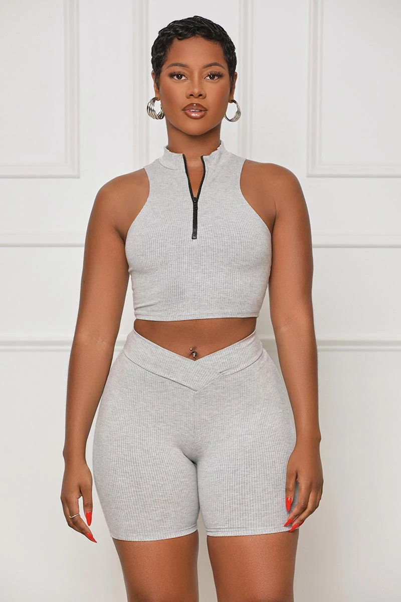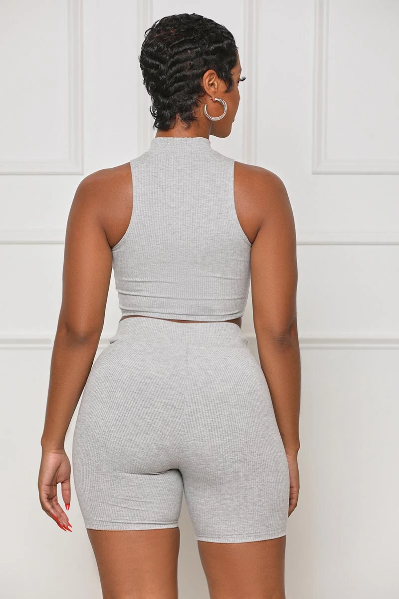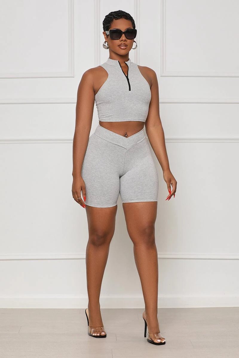 Contour Ribbed Zip Up Shorts Set (Grey)