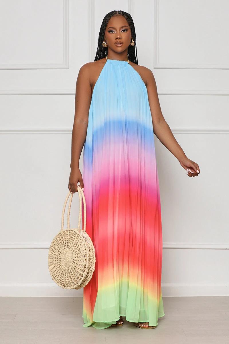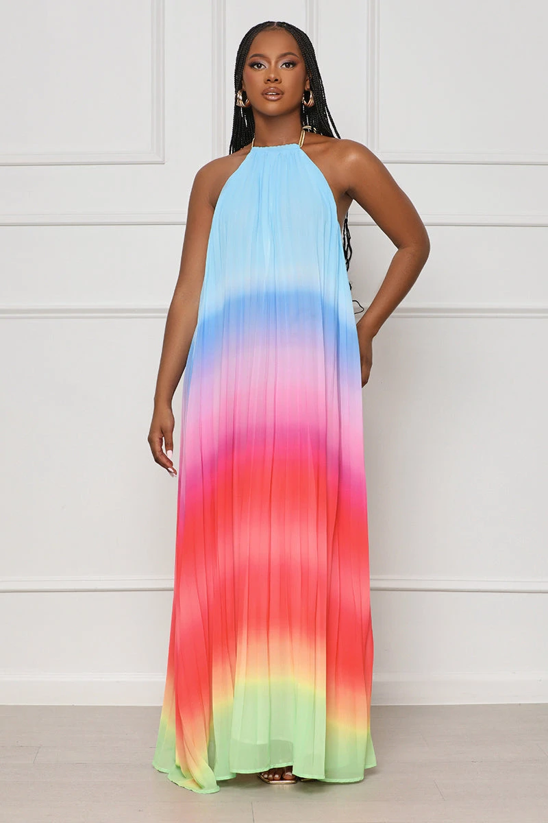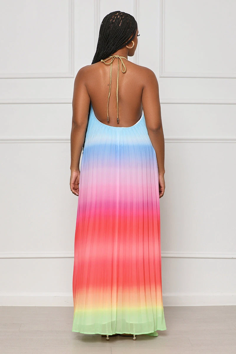 This beautiful Dancing Desire Pleated Ombre Maxi Dress is just what you need for your summer wardrobe! Featuring a vibrant ombre print, braided gold rope halter necktie, full lining, and an open-back design; this dress is perfect for your next vacation or special event. Pair with simple gold jewelry, a fashionable high heel, and a mini bag.