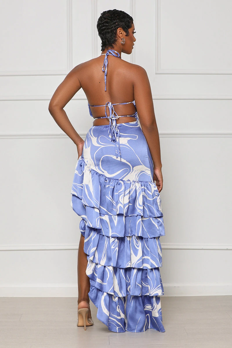 Look stunning in the Dream Lust Ruffle Maxi Dress. This sophisticated piece is made of high-quality fabric, featuring a back zipper closure with a halter neck tie and pleated keyhole cut-out. The tailored fit and ruffles create an elegant silhouette, ensuring you look amazing wherever you go.