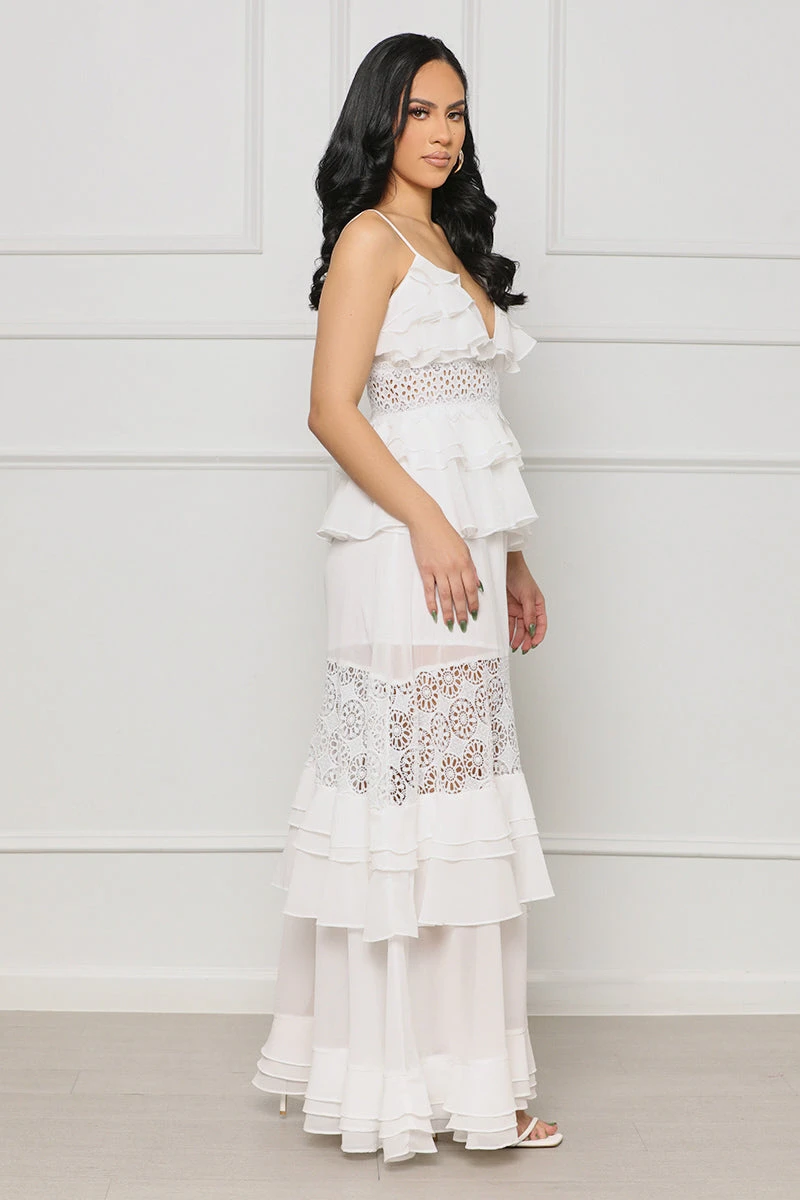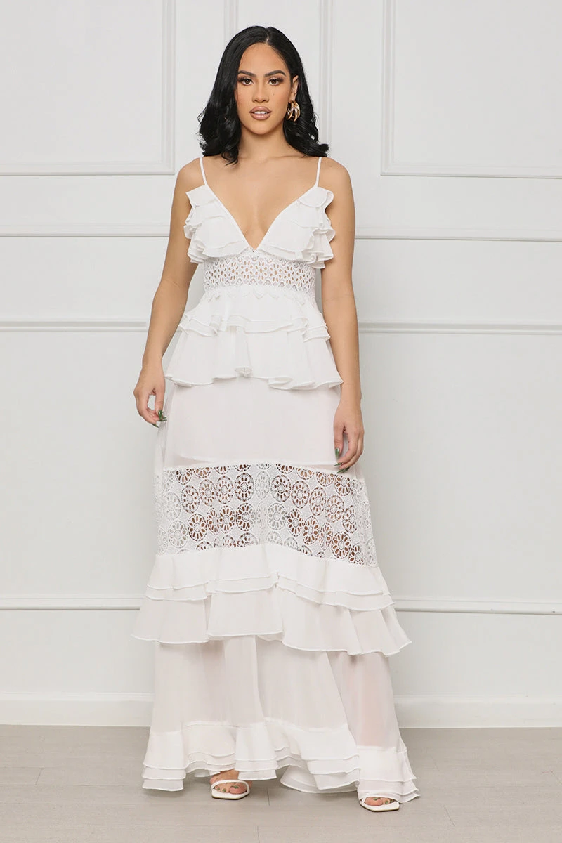 Delight in a look of exquisite elegance with the Dreamy Coast Ruffle Maxi Dress. Featuring a plunging neckline and sheer ruffled layers that cascade down the body, this dress is the perfect embodiment of luxury and grace. Lined and lightweight, it is ideal for a glamorous beach vacation.