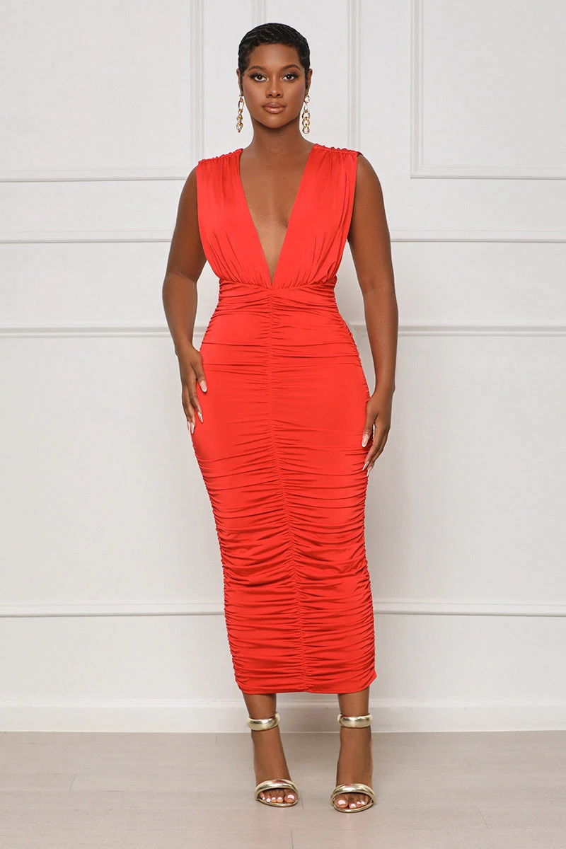 Make a lasting impression in the Evening Sensation Ruched Midi Dress. Carefully crafted, it contours your curves elegantly to create a sleek look, while the plunging neckline adds a hint of drama. The ruching detail completes the look with texture and dimension. For a chic evening look, pair it with statement jewelry and a clutch for an unforgettable entrance. Perfect for a gala event or evening dinner.