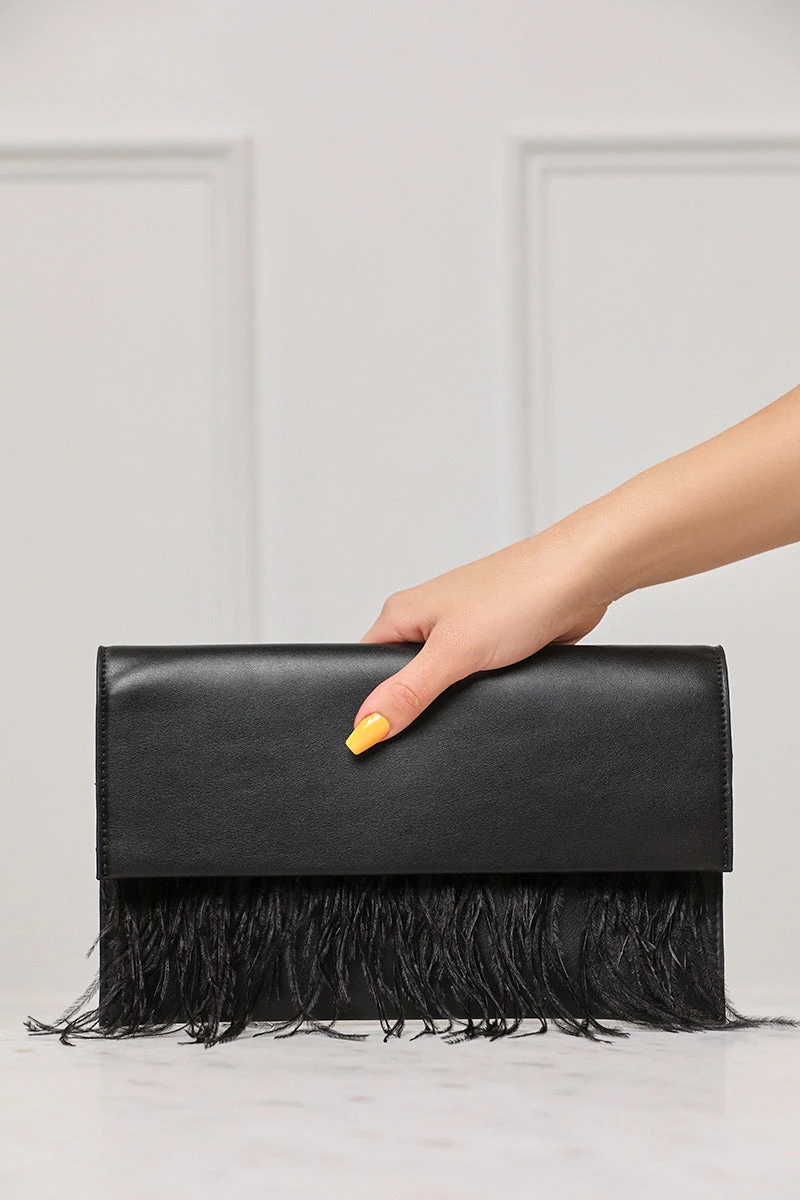 The Feathered Clutch is light and fun, with a modern yet elegant style. It makes a glamorous statement with its feather trim, lightweight fabric, and fold-over silhouette. Secure your belongings with a magnetic snap closure and removable chain strap to carry as a clutch or shoulder bag.