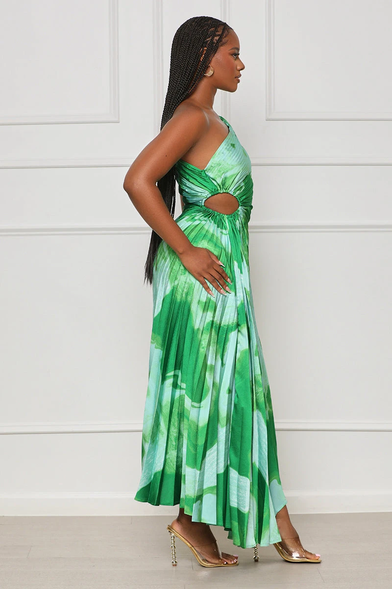This Exotic Hues One Shoulder Dress is all you need to create a casual beach vibe with your outfit. The watercolor print on the fabric creates a fun, colorful look that is perfect for your next vacation. This piece features pleats throughout the dress, keyhole cut-out detailing on the side of the dress, side zipper closure with a keyhole cut-out detailing and an easy pullover style.
