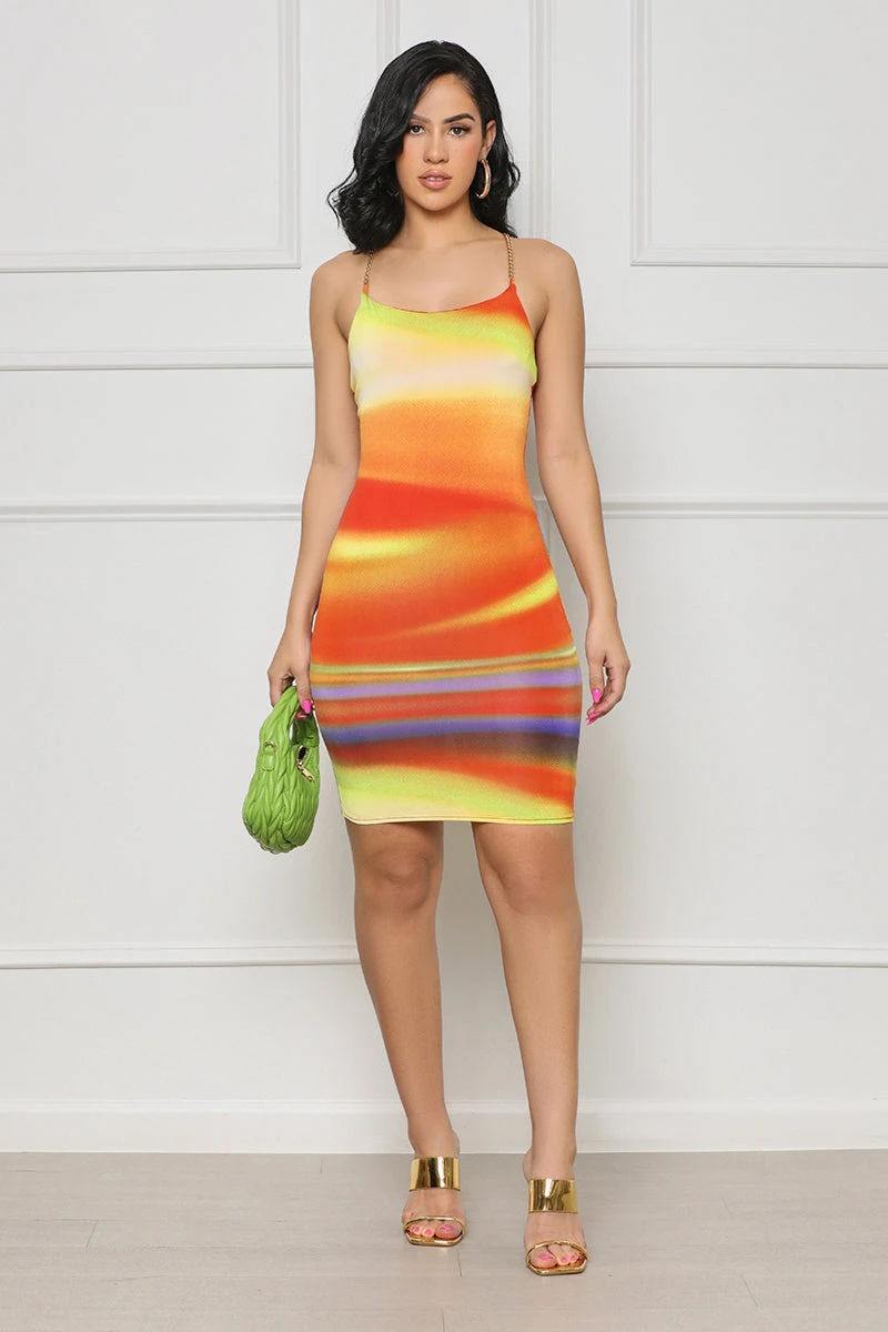 Transform your look with this Fierce Energy Ombre Mini Dress. Crafted from a vibrant ombre print, it features chain strap detailing and hugs the silhouette for a truly eye-catching statement piece. Perfect for those summer nights, style with heels and a gold bag to complete the look.
