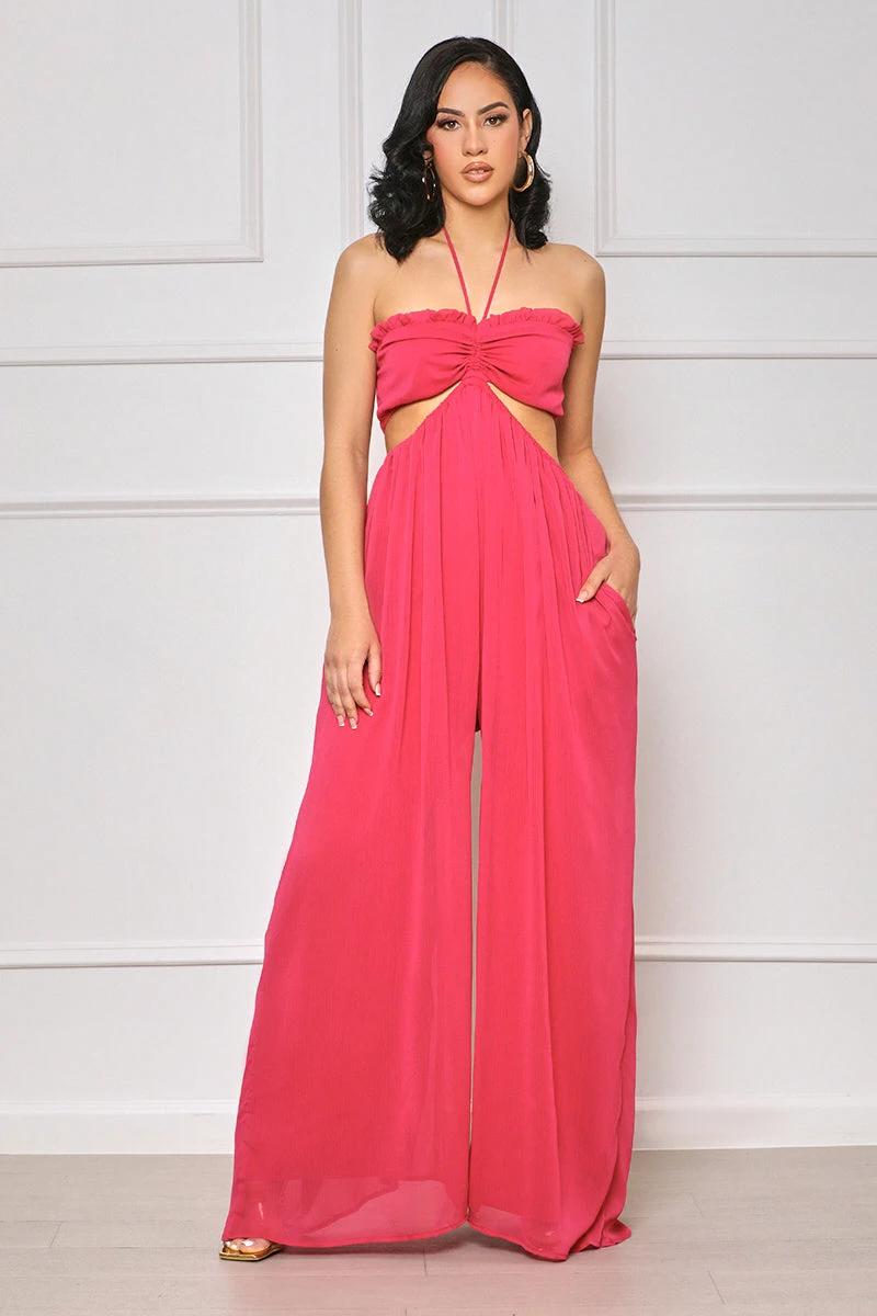Our Fierce Voyage Halter Top Jumpsuit is a stylish piece that exudes elegance and grace. Crafted from a soft and airy fabric with an adjustable halter top fit, it’s perfect for those days when you need to look your best. The back cut-out takes your style up a notch. Whether it’s a Sunday stroll or running errands, this piece is sure to add a special touch to your look. Finish off the ensemble with your favorite shades and a straw bag.