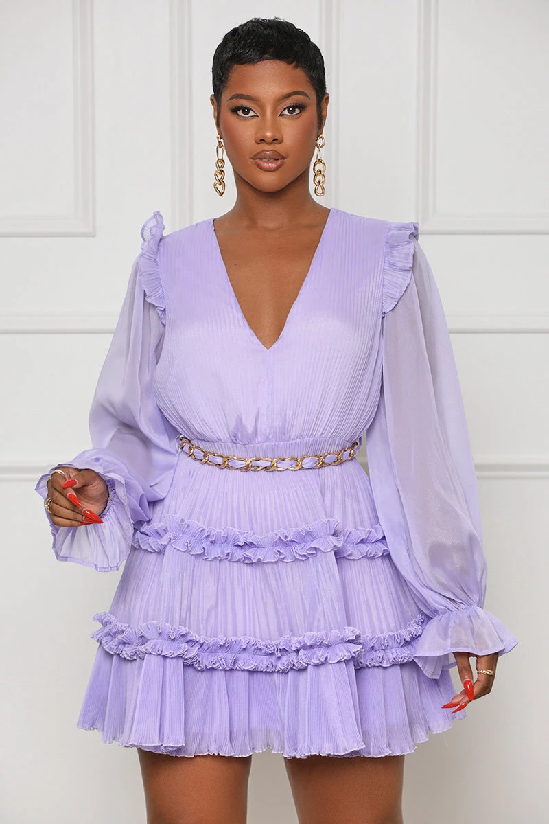 Make a statement in the First Best Plunge Ruffle Mini Dress. Its sophisticated design, which features a tired ruffle throughout the dress, plunge detailing, and a removable chain belt, exudes luxury and exclusivity. Add to the look with pumps and a bag to complete the ensemble.