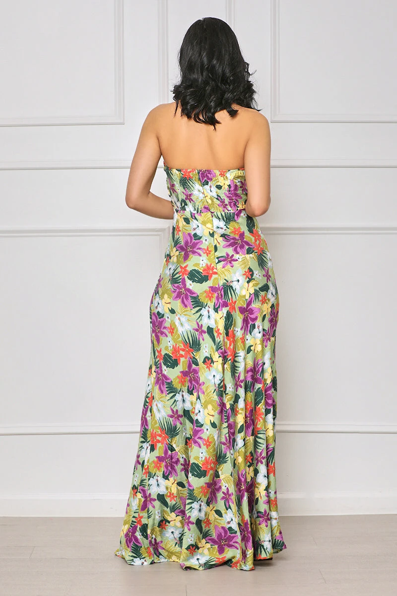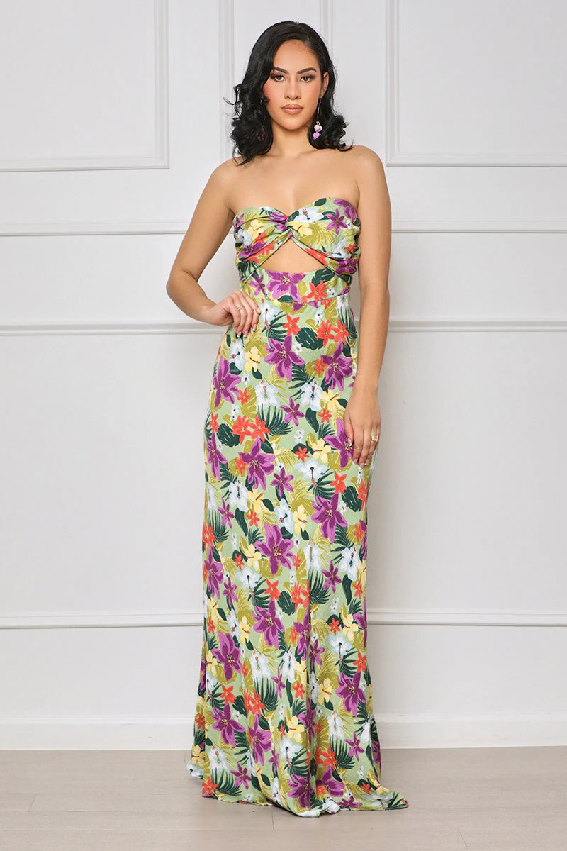 Look stunning in this Floral Emotions Cut Out Maxi Dress. Detailed with a cut-out design and back zip closure, this piece is sure to turn heads. Boasting a vibrant green multi-colored floral print, this dress is perfect for a night out on vacation.