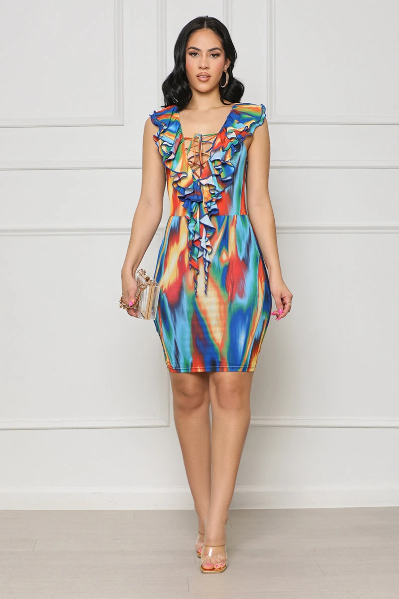 Look chic and stylish in the Front Row Ruffle Mini Dress. Crafted with a beautiful mesh material and featuring a ruffled design cascading down the middle and drawstring detailing, this dress will have you standing out from the crowd. The inner lining ensures ultimate comfort, making this dress the perfect go-to for special occasions.
