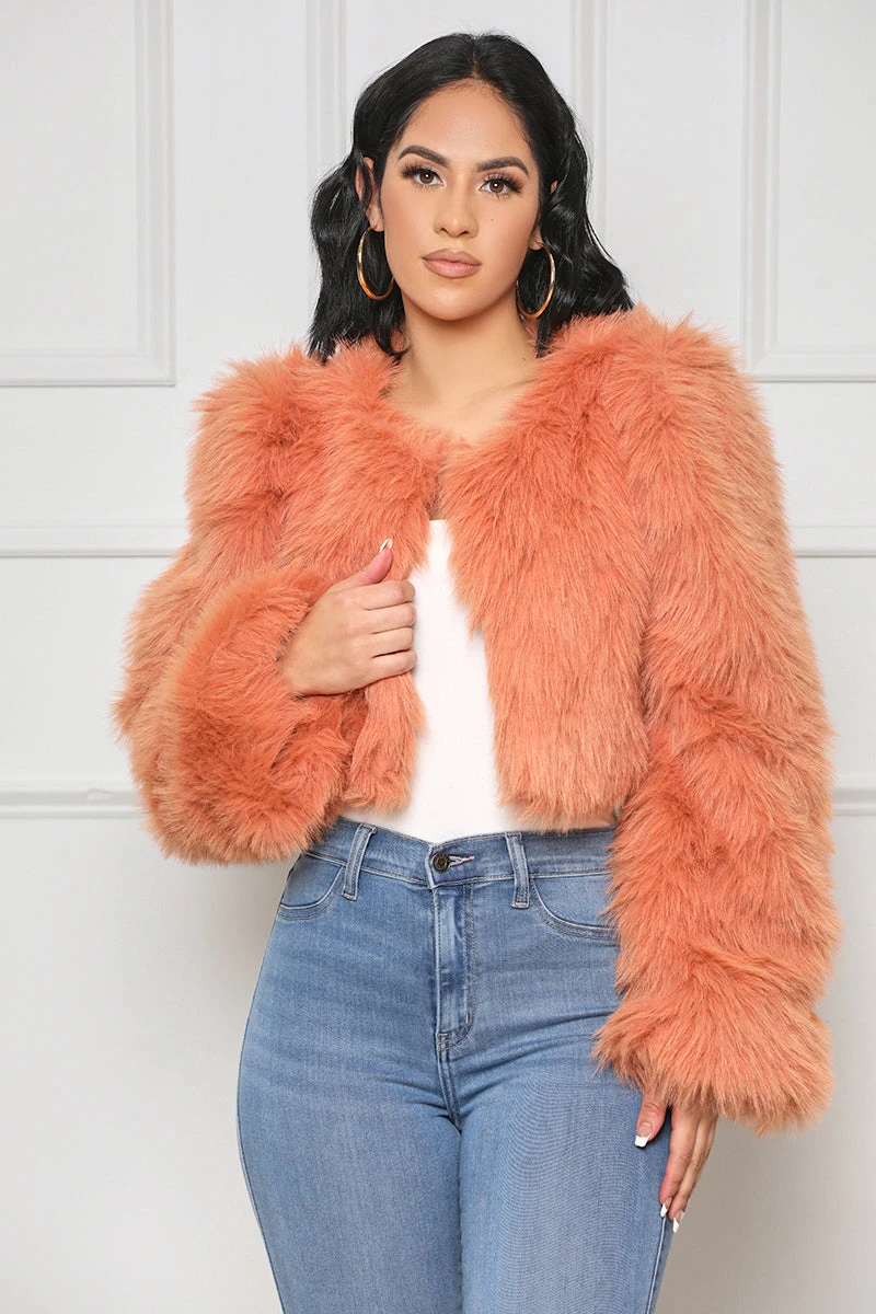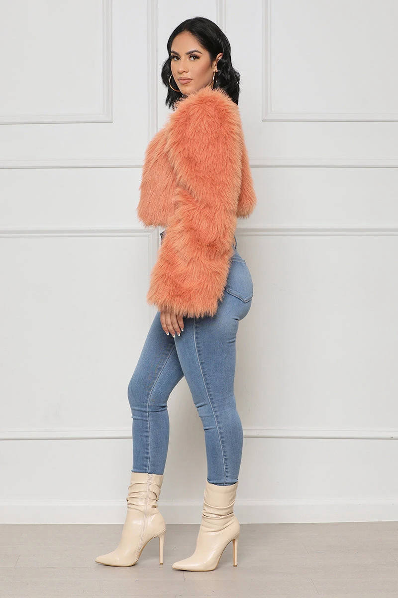 Make a bold statement with our Fuzzy Embers Faux Fur Crop Jacket. This warm and toasty coat features a soft and plush peach faux fur that adds instant luxe appeal to any outfit. It’s the perfect way to stay warm in style when the weather turns cold!