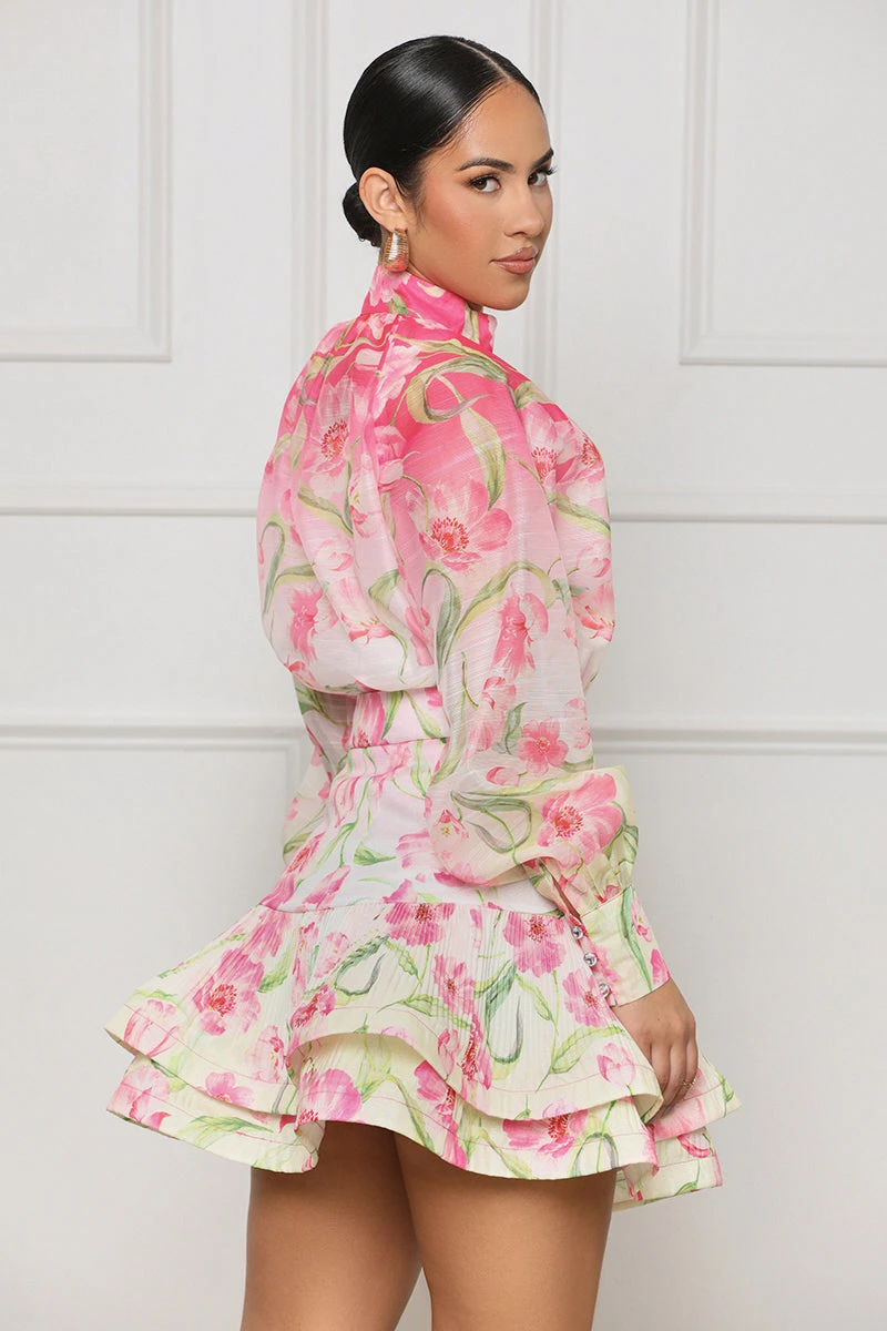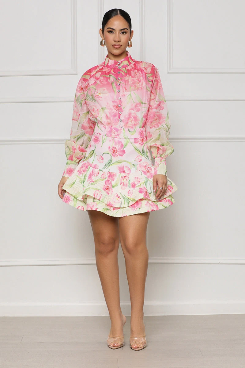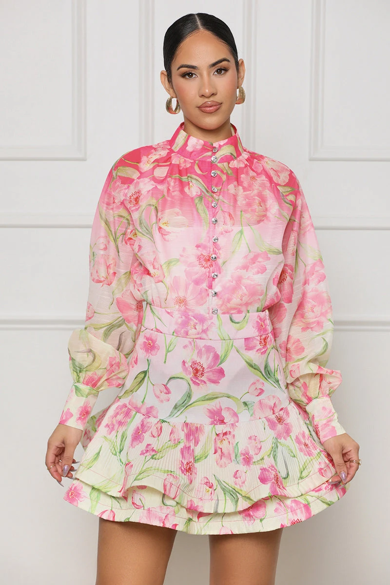 This Garden Dreams Sheer Skater Skirt Set is made with floral print throughout. The pleated skirt has a side zipper closure and pairs well with the blouse, while each piece can also be worn separately or together. The blouse has jeweled buttons down the front and a high neckline. Pair with heeled sandals and gold jewelry for an effortlessly chic look.