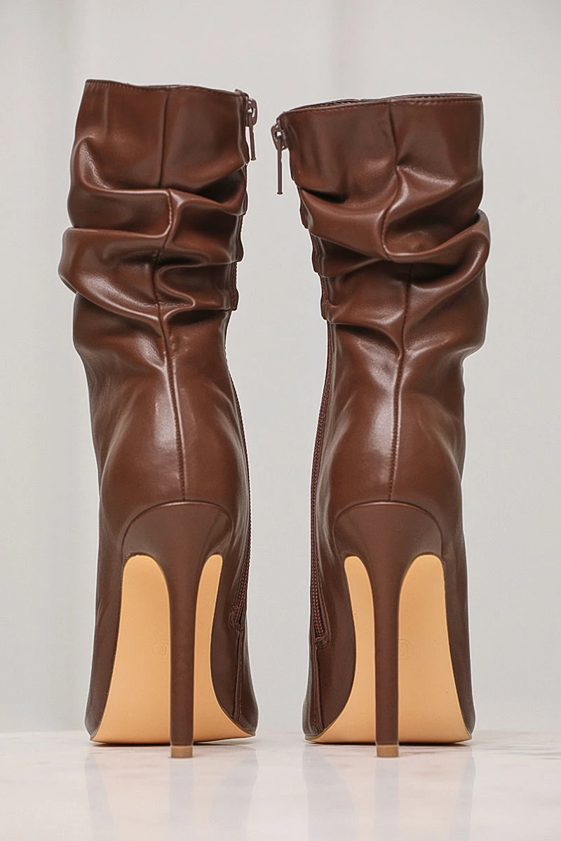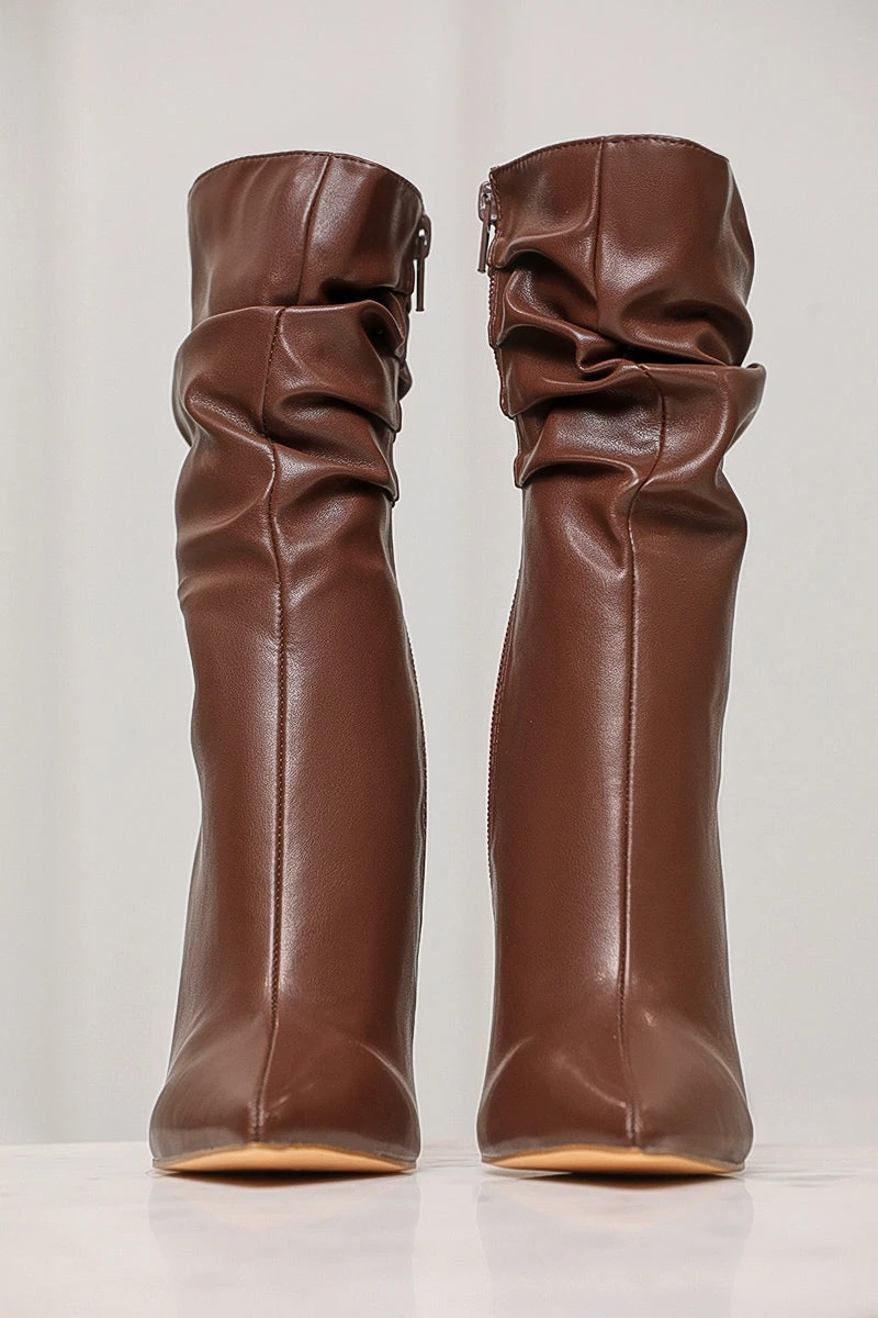 These faux leather booties are a must have for the new season! They are the perfect addition to any of your fall/winter looks! These booties feature a faux leather fabric, ruched detailing, a zipper side closure, pointed toe and a high heel. Dress them up with a pair of jeans or faux leather pants, a stylish top and your favorite hand bag!