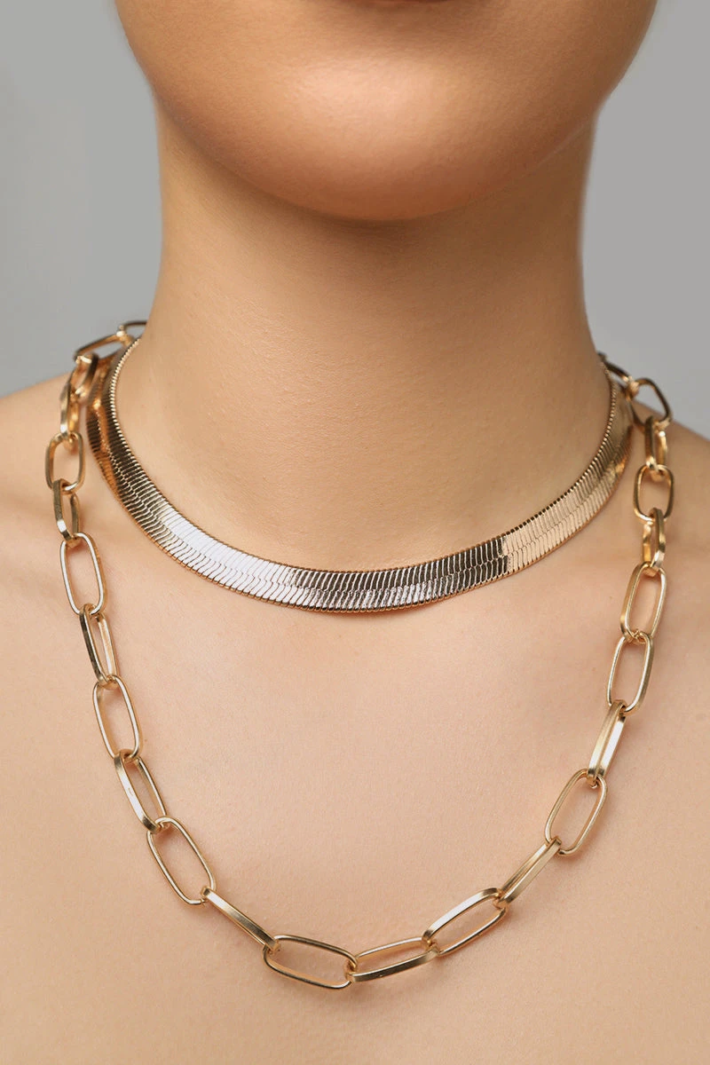 This Gold Chain Link Set is perfect to complete any look with a touch of gold and glam. The first necklace is a light chain link with a unique clasp, while the second necklace is highlighted by beautiful gold hardware.