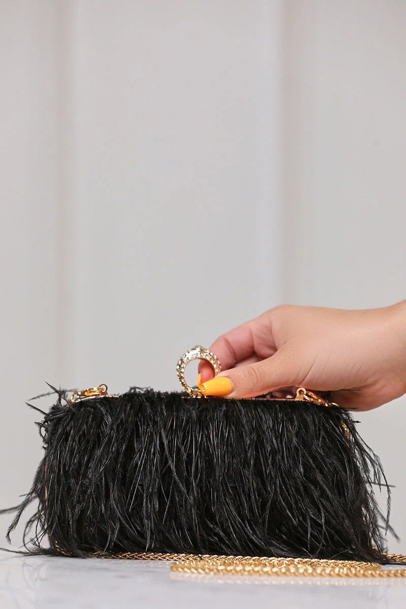 A glamorous accessory that is sure to make a statement, the Harlow Feathered Box Clutch is an evening essential. This elegant clutch features gold-accented trim and a finger hole feature with jeweled detailing. This clutch can be worn on its own or carried over your shoulder using the removable chain strap. An accessory sure to have heads turning all evening long.