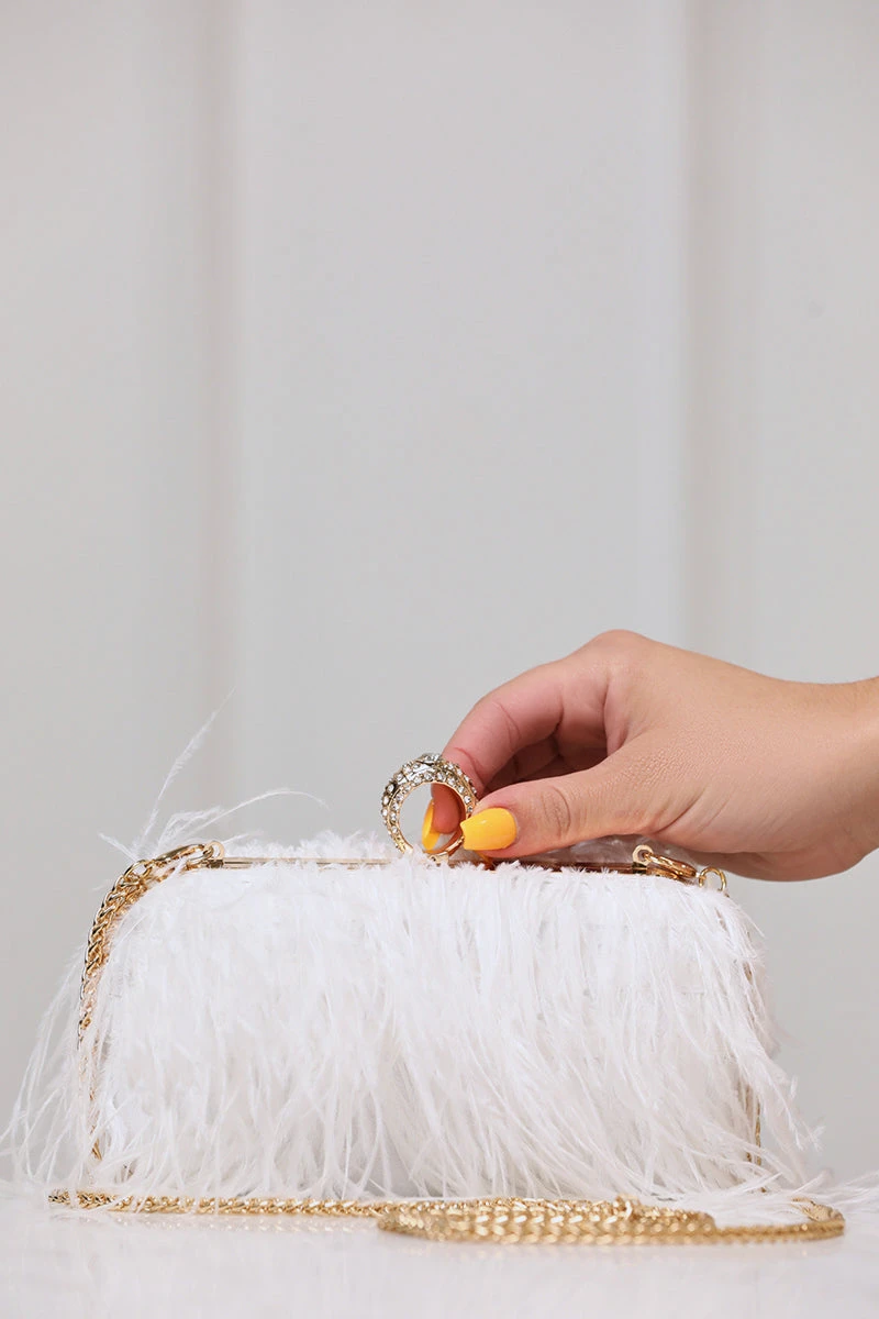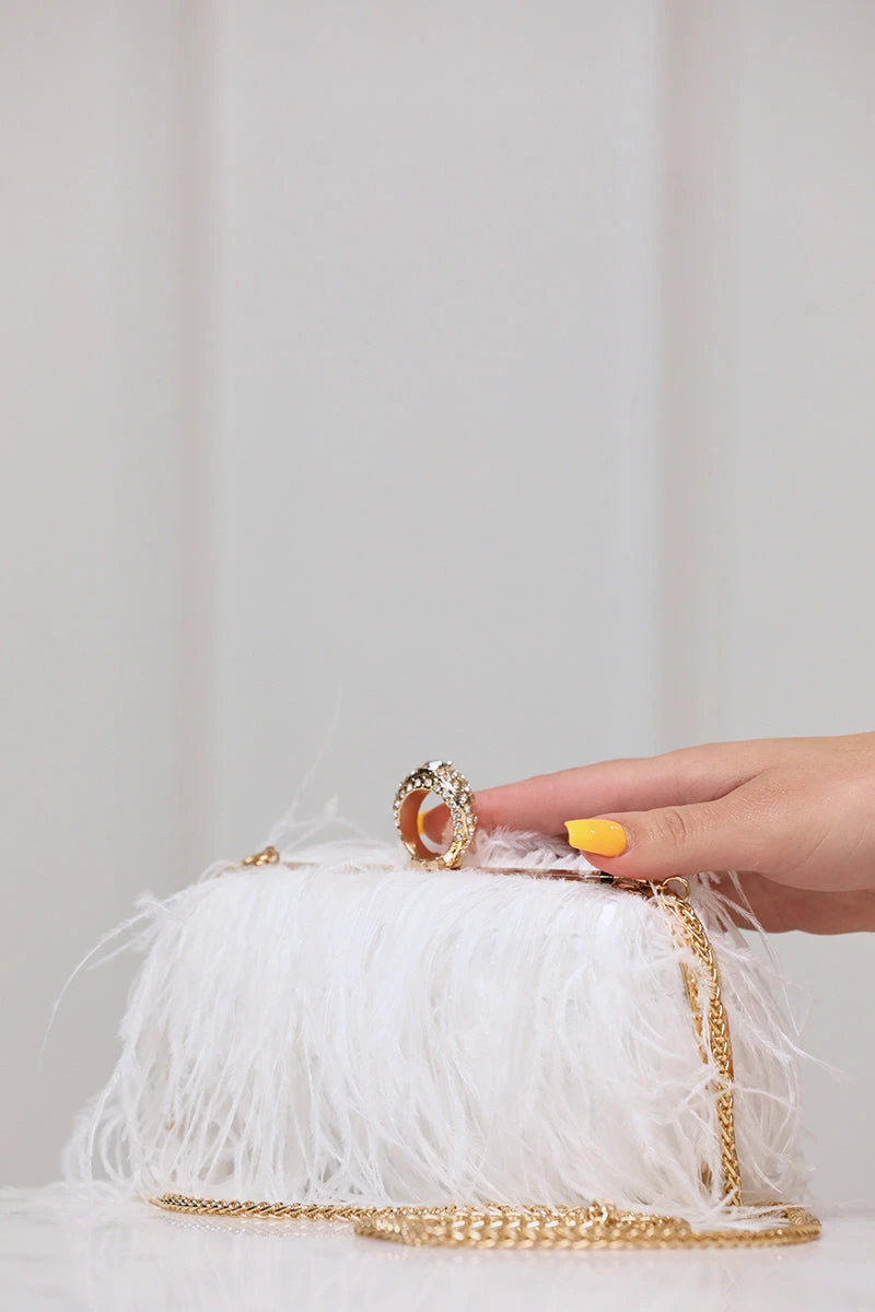 A glamorous accessory that is sure to make a statement, the Harlow Feathered Box Clutch is an evening essential. This elegant clutch features gold-accented trim and a finger hole feature with jeweled detailing. This clutch can be worn on its own or carried over your shoulder using the removable chain strap. An accessory sure to have heads turning all evening long.