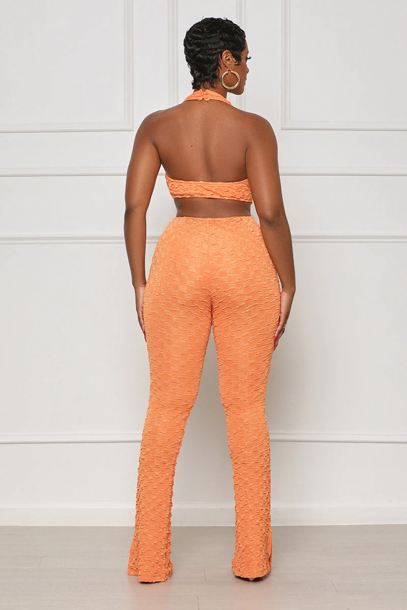 Our Here To Lounge Halter Top Jumpsuit is designed to give you the perfect balance of comfort and style. Crafted with a halter top, back cut-out, and textured print, this vibrant jumpsuit will bring life to your wardrobe. The very stretchy, slightly flared leg adds to the comfortable fit, making it the perfect choice for running errands, happy hour, or any other occasion. Pair with stylish heels or flats for the perfect look.