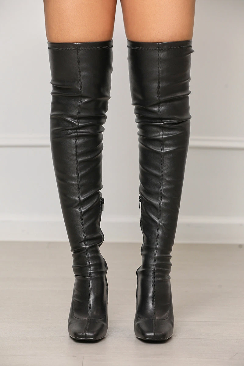 The Icon Faux Leather Thigh High Boots are classic thigh-high boots with half zipper closures near the ankles. The square-toe design of this boot makes them comfortable enough to wear for hours, and gives them a stylish look that is sure to turn heads wherever you go.