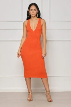 Take your wardrobe to the next level with this Just Enough V-Neck Ribbed Midi Dress. Its stretchy ribbed fabric and vibrant color make it the perfect choice for any occasion. The midi length adds a touch of elegance and sophistication.