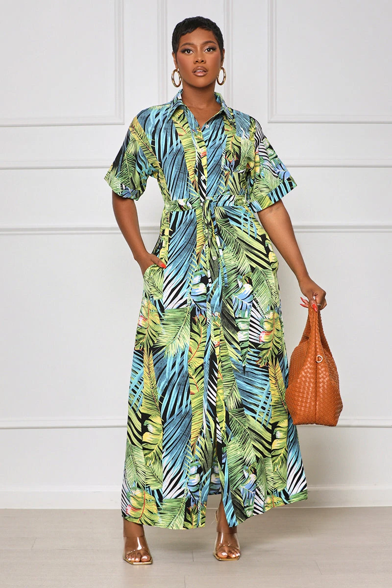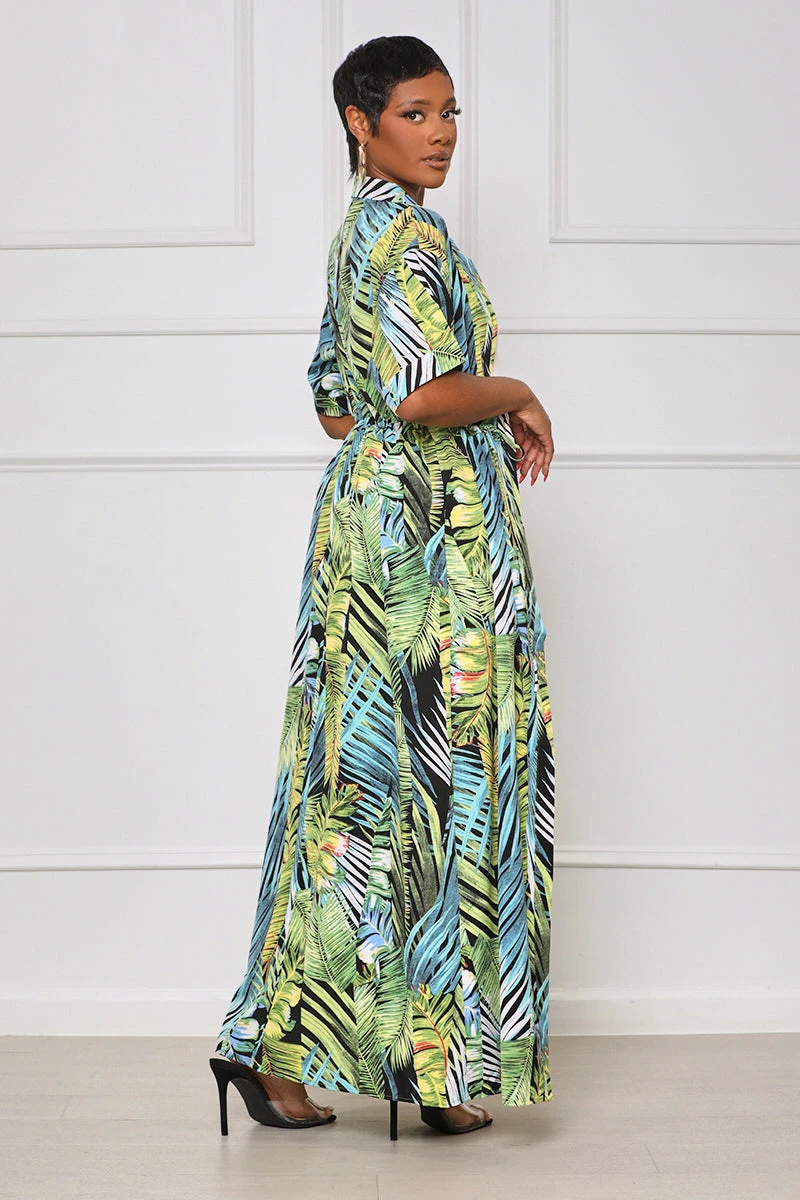 Bold and beautiful, the Just Paradise Button Down Kimono will help you make an unforgettable statement. Its unique print, colored neckline, drawstring waist, and versatile button-down design offer exciting styling options. Wear it as a kimono or turn it into an eye-catching dress. Elevate this look by pairing it with strappy heels and a chic straw bag for an effortless summer ensemble.