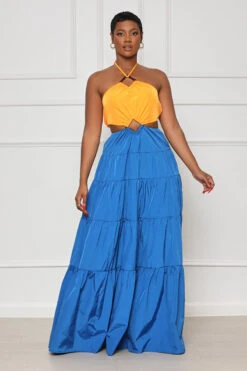 This opulent Key West Cut-Out Halter Dress is a must-have for your next vacation. This halter maxi dress features a wood-accented square, ruched tired design, providing a luxurious look with an airy silhouette for a light, effortless feel. Styled with heels and your favorite straw bag, this dress radiates exclusivity and sophistication.