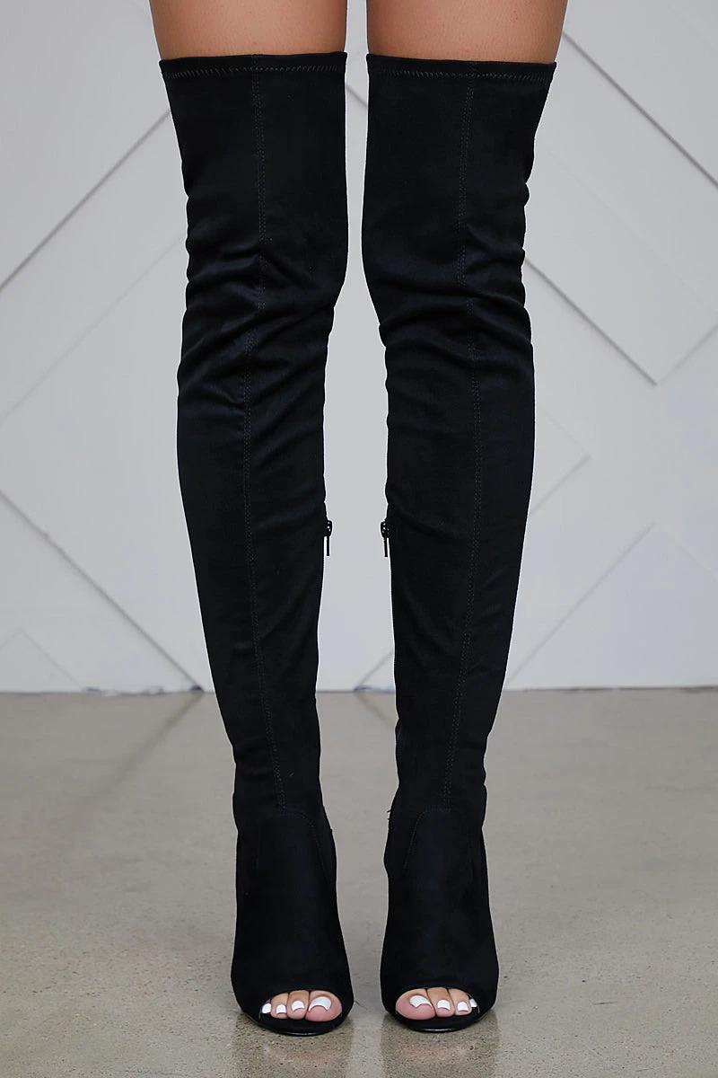 We’re bringing back our bestselling Lori thigh high peep toe boots in multiple styles perfect for all your fall festivities. Featuring a trendy block heel, padded insoles, open peep toe cut out and side zipper closure. These boots are made of a timeless soft suede stretch fabric that is wide-leg friendly and sits just above the knee. Styling this boot is versatile and easier than ever. Dress them up with your favorite sweater dress or keep it casual with a pair of jeans and a statement top for the ultimate outfit.