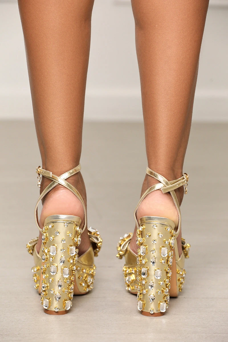 Take your look to new heights with the Maya Jeweled Metallic Bow Heels. With a vibrant gold metallic finish and a sparkly array of jeweled embellishments, these statement heels will bring a touch of luxe to any outfit. Not to mention, a platform heel, buckle closure, and exquisite bow detailing complete the timeless, but totally on-trend look. Bejewel your wardrobe with an unforgettable finish.