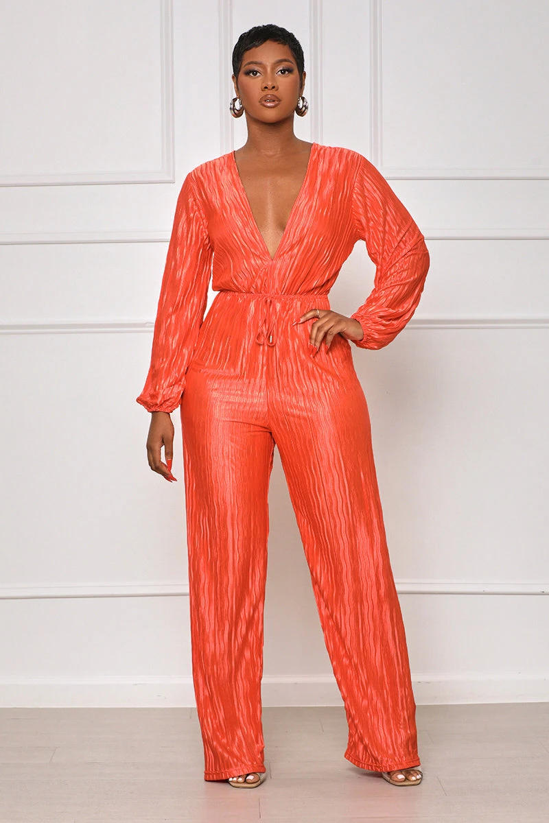Our New Standard Wide Leg Plisse Jumpsuit is the epitome of modern chic. Boasting a plunge neckline and adjustable back closure, this luxe piece is tailored to ensure the perfect fit for any occasion. With its drawstring waistband and wide-leg silhouette, this statement jumpsuit is sure to turn heads at any Sunday brunch. Finish off your look with a pair of heels and a small handbag.