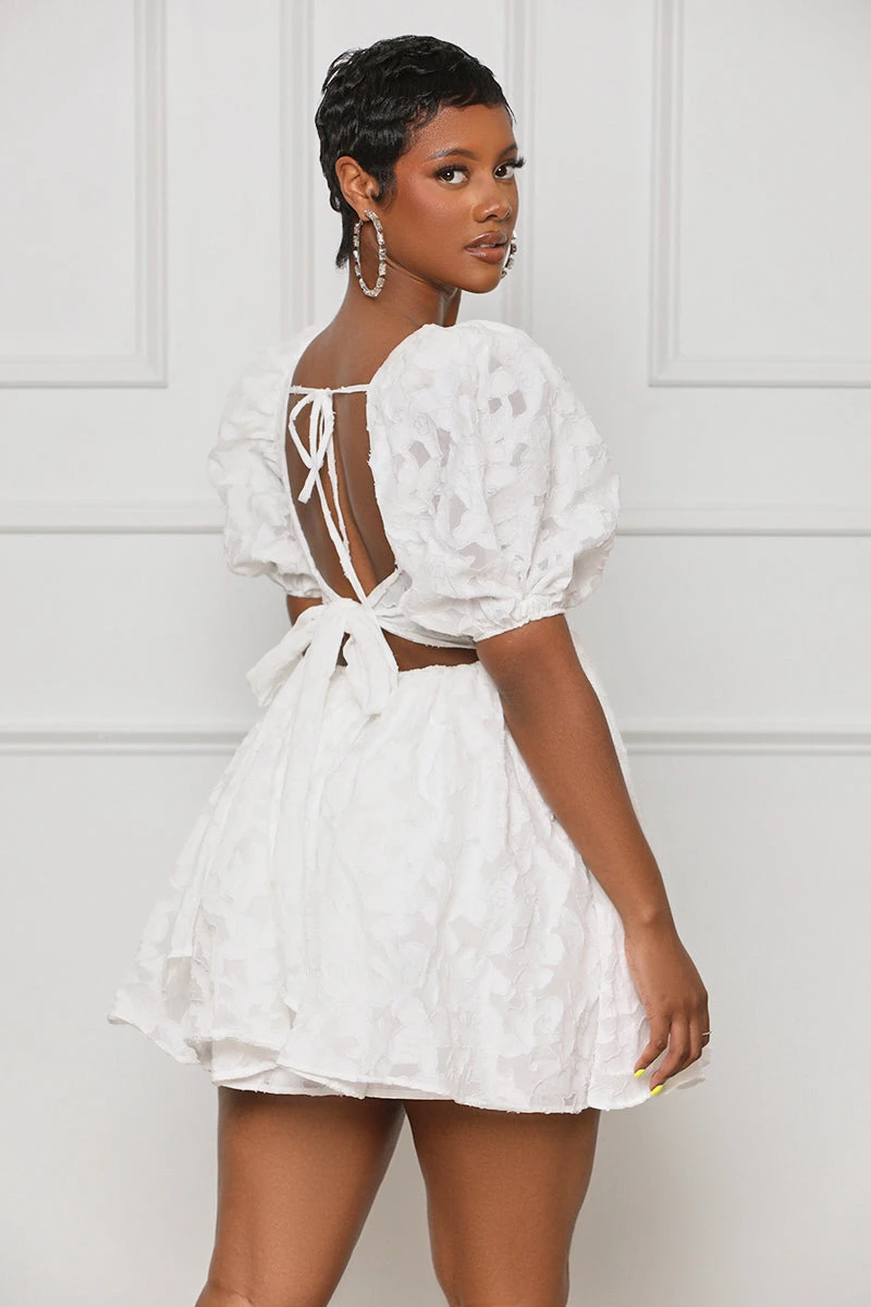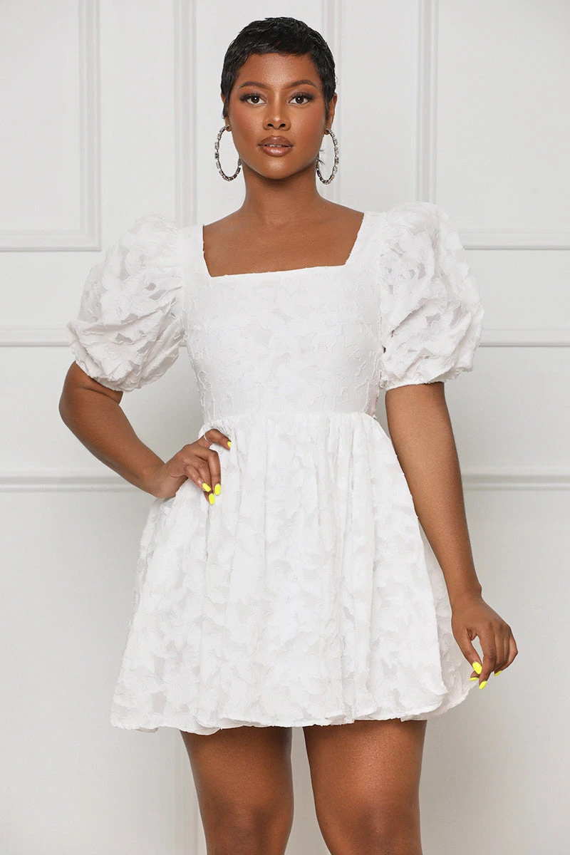 Our picnic ready baby doll dress will have you feeling like a princess. The gorgeous puff sleeve design, square neckline, and adjustable back detailing make this dress fun to wear anywhere. The ruffle edge style adds a delightful touch. Wear it to your next picnic or lunch date and style with sandals or heels with a straw bag.