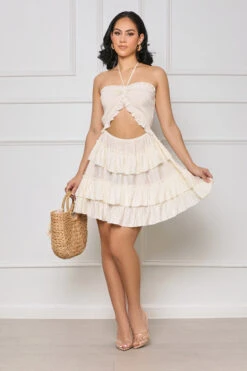 Our Picnic With Me Halter Top Mini Dress is an effortless way to look stylish this summer. With a halter top and cut-out midriff, it flatters your figure while the ruffle detailing adds a touch of modern elegance. Whether you dress it up with heels or keep it casual with flats, it’s perfect for a picnic in the park. Complete the look with a straw bag for the perfect summer stroll.