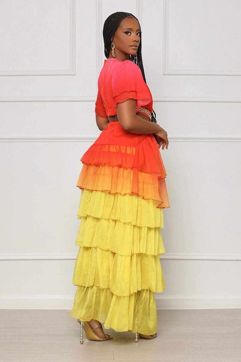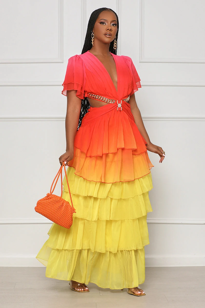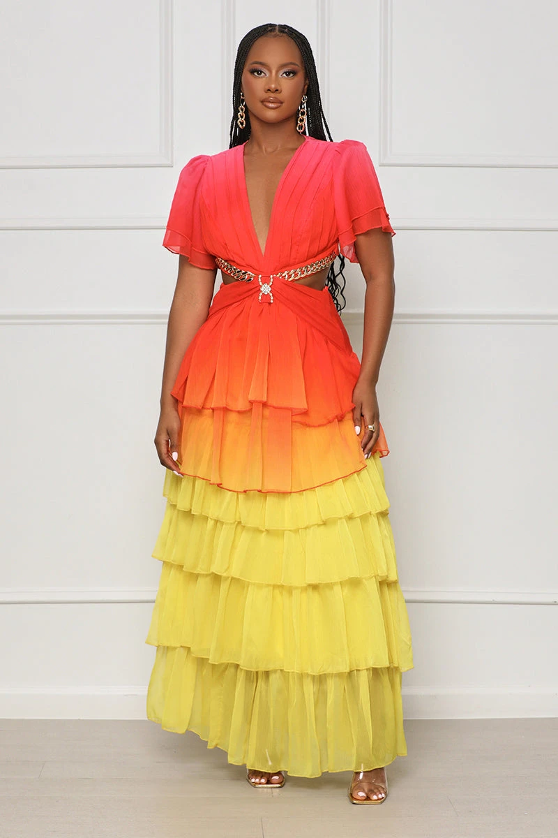 Elevate your wardrobe with this luxurious Playful Sunshine Ruffle Maxi Dress. Crafted from a charming blend of vibrant red hues, this maxi dress features a cut-out chain detailing, a plunging neckline, and a back zipper closure for a look that’s elegant yet playful. Perfect for vacation or special occasions, this is the perfect piece to add a touch of elegance to any ensemble.