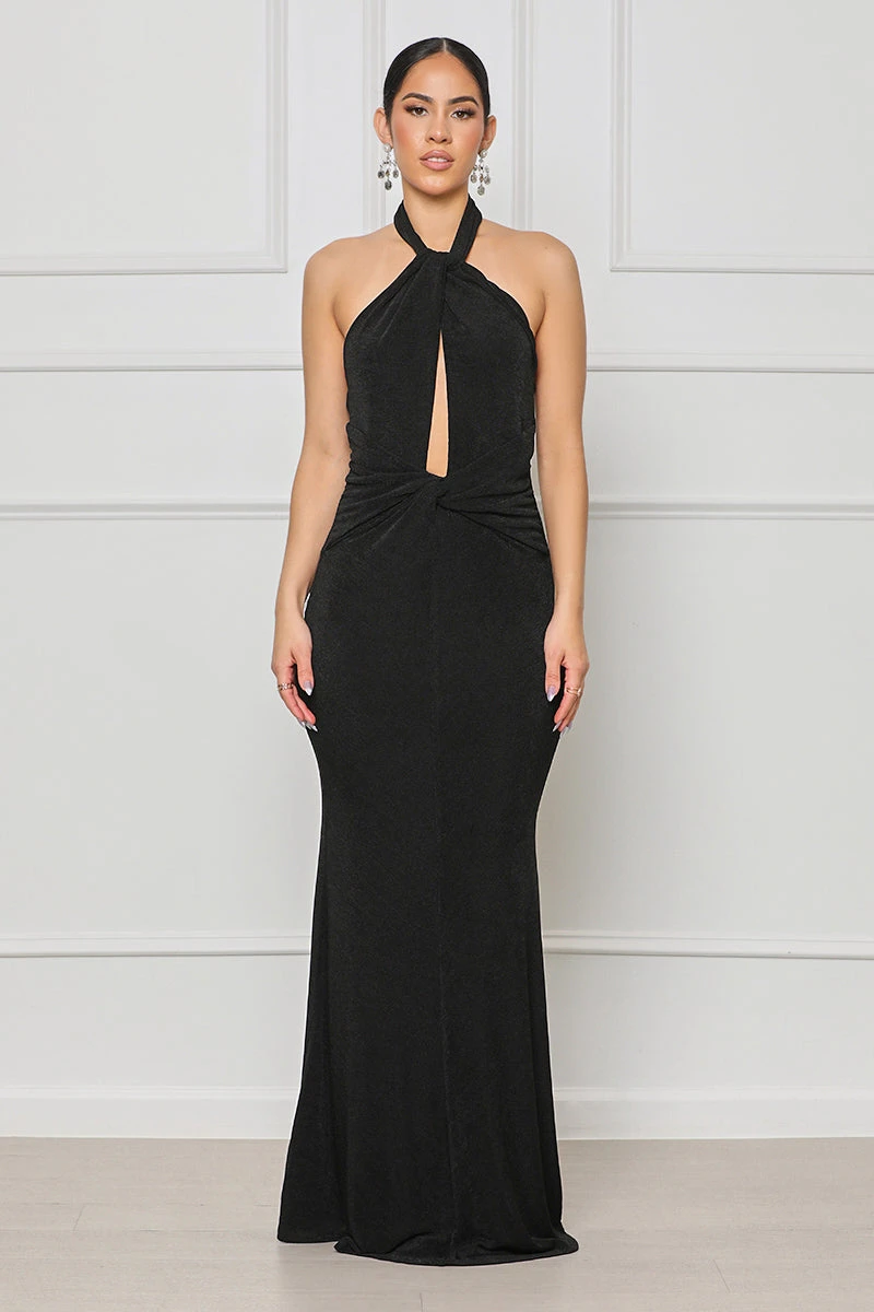 The Plunge Halter Maxi Dress is a glamorous dress that’ll turn heads at any event. The plunging cut-out in the front draws attention and the halter tie with button loop closure at the neck gives you maximum comfort and support. This maxi dress is made of a slinky-like material with a rear zipper closure and lining underneath, that moves with you and has a lot of stretch so it’s easy to wear, no matter what size you are.
