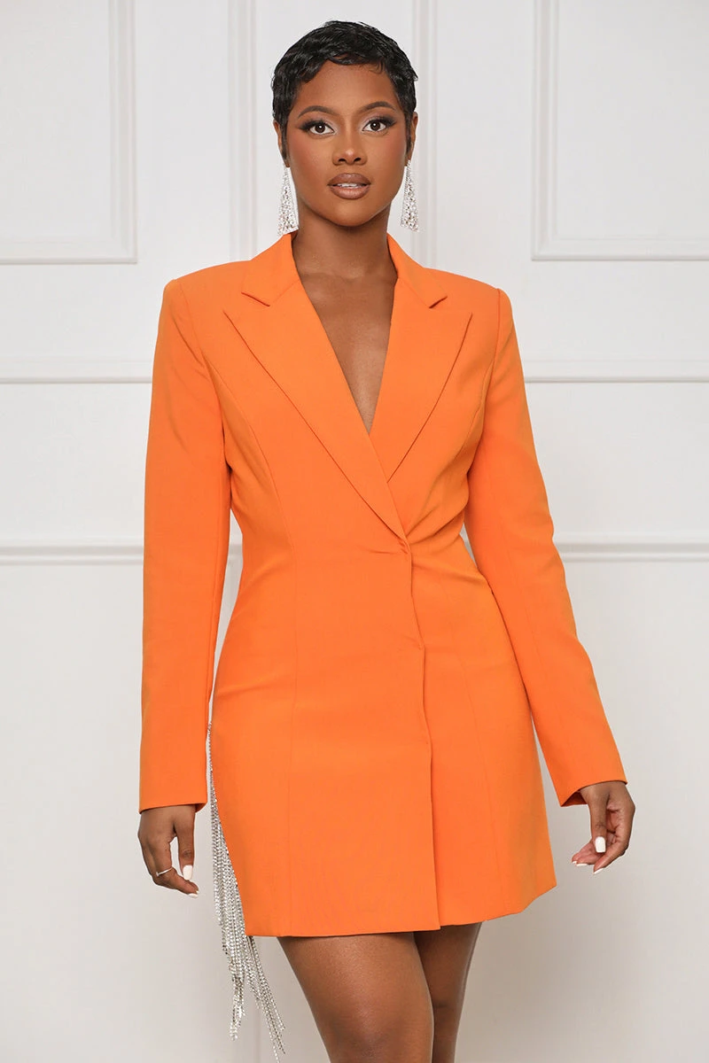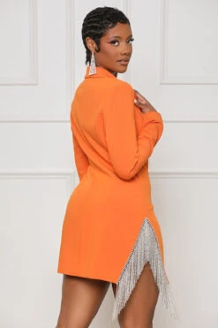 Sleek and sexy, our Rhinestone Fringe Blazer Dress is an eye-catching statement piece. Features include a side slit with rhinestone fringe, front button hooks, a collared neckline, and a mini dress length to complete the look. Pair it with pumps for a special occasion.