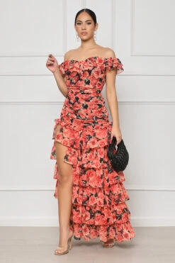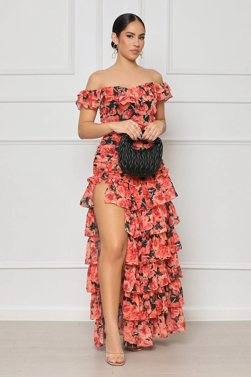 This Ruffled Floral Maxi Dress features off-the-shoulder sleeves with ruching at the bodice and ruffles throughout to give you an elegant yet vibrant look for that summer wedding or vacation in Europe. The side slit will let you feel fresh and cool on hot city streets, while the side zipper closure and double lining guarantee comfortability on all-day excursions. Pair this dress with your favorite pair of lace-up heels to complete your look.