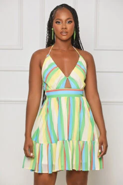 The Samba Strut Striped Halter Dress is a stylish yet comfortable choice for any event. The yellow and multi-colored striped mini dress is lined for extra coverage. With its halter neckline and elegantly cut silhouette, this dress is sure to make a statement.