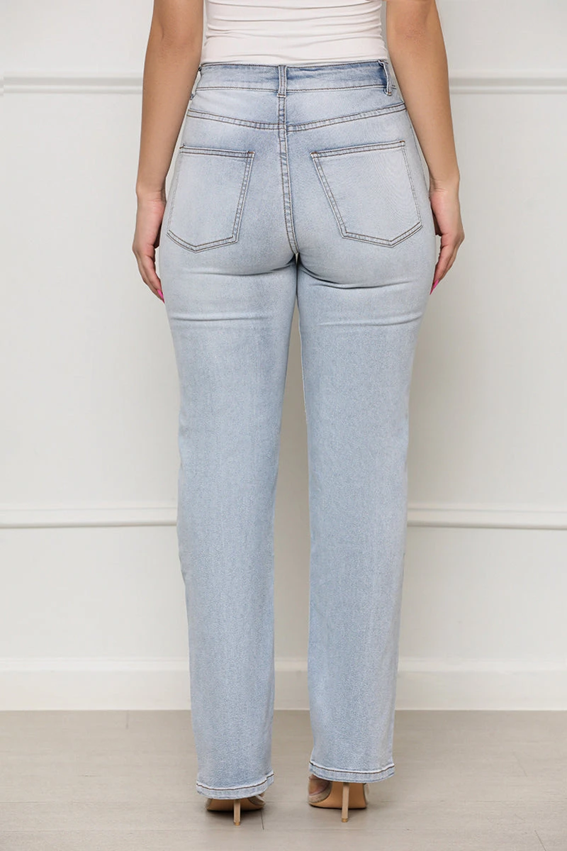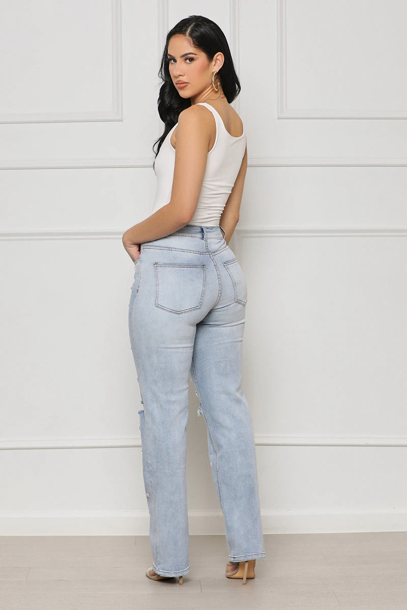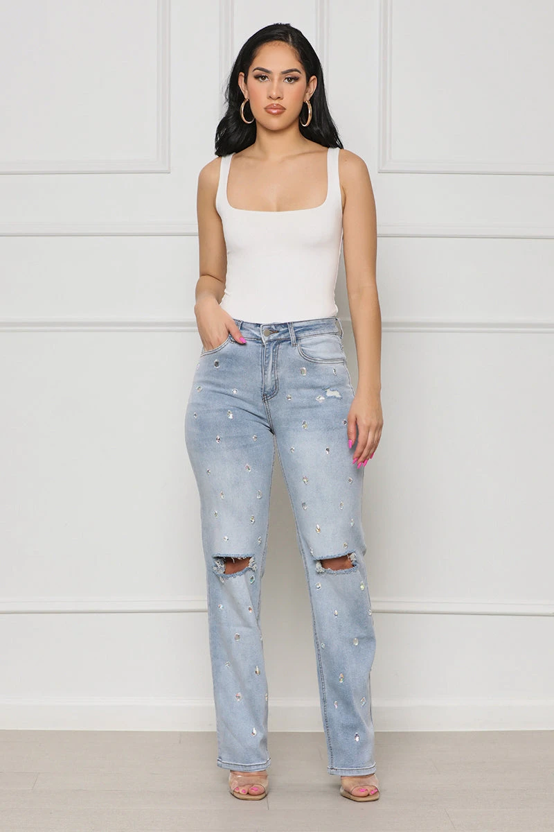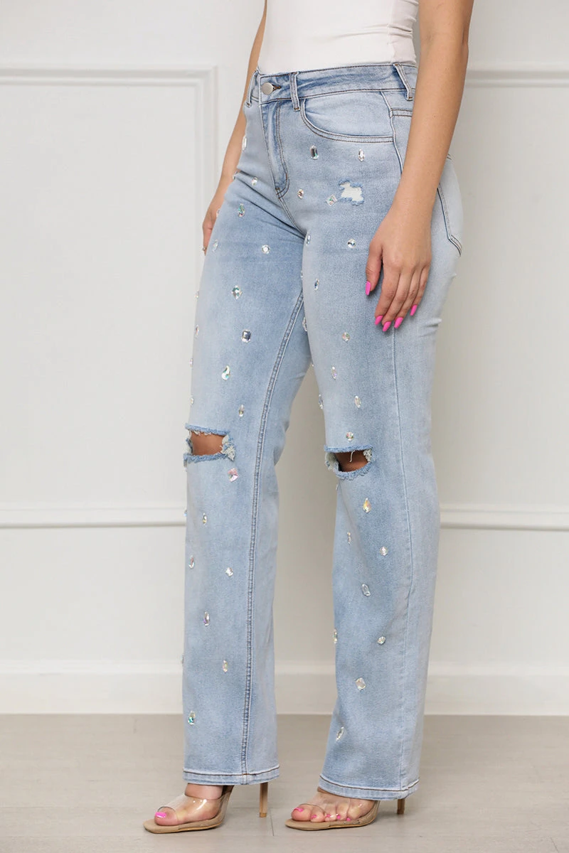 Make a statement wherever you go with these Shine Bright Embellished Denim Jeans. Styled with jeweled embellishments, light wash, and distressed detailing, these jeans will provide you with a unique look for your next concert or outing, guaranteed to have all eyes on you. Pair with your favorite top or bodysuit to create the full look.