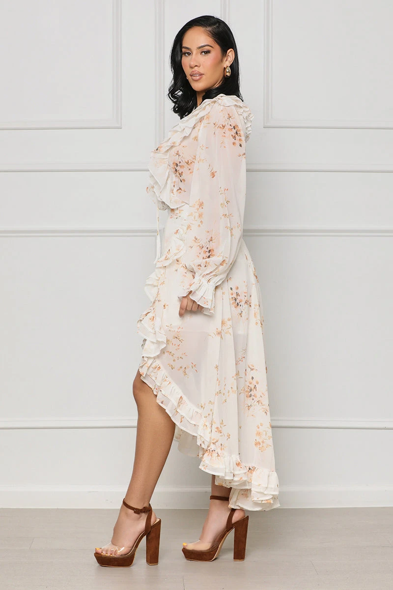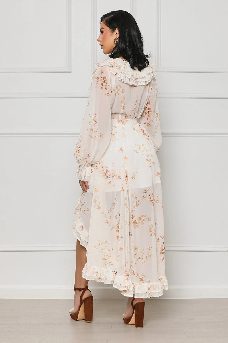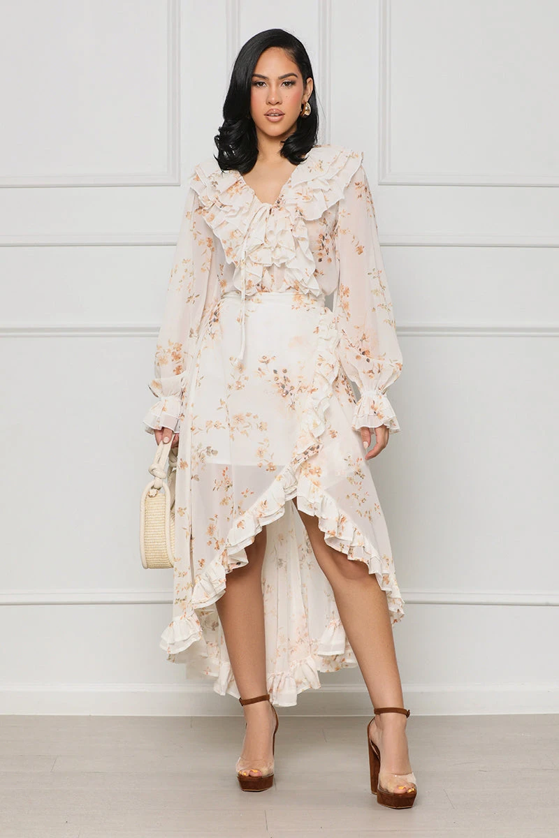Our Spring Belle Sheer Ruffle Skirt Set is a whimsical and romantic piece for your wardrobe. Its diaphanous silhouette drapes gracefully over the body with cascading ruffles providing an airy and sophisticated feel. Its floral print and inner lining add a subtle flair, making it the perfect ensemble to style with a straw bag and accessories for a chic and effortless look.