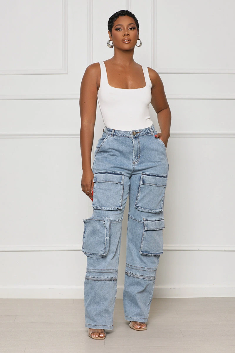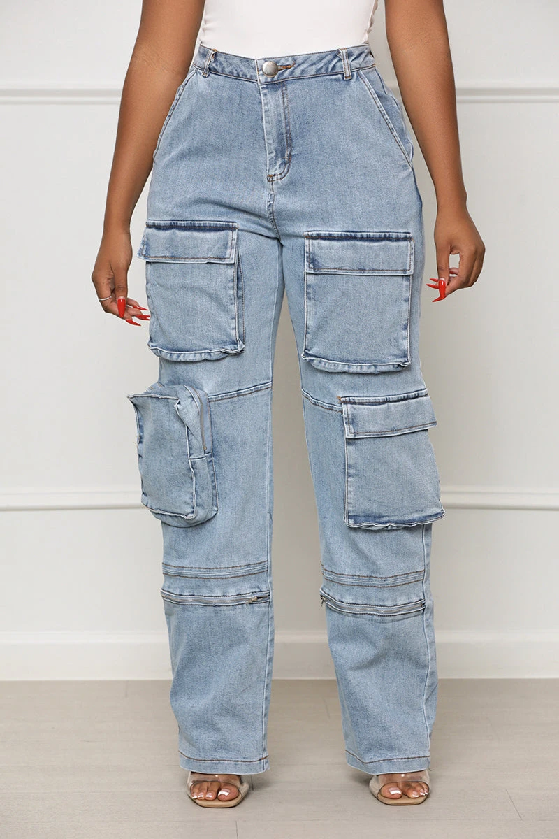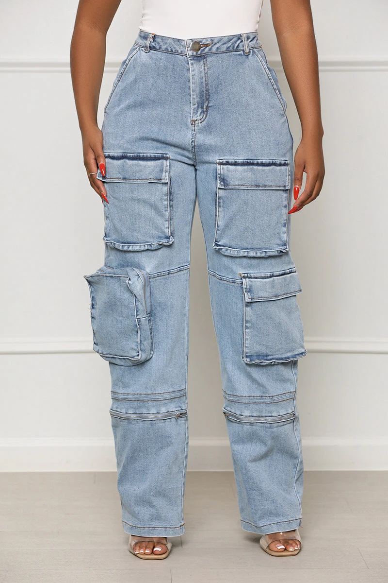 Step out in style with our Stand Out Cargo Jeans. These cargo pants are an edgy statement piece. Featuring zip-up pockets throughout the pants legs, and two side and back pockets, these jeans provide practicality and luxury with ease. Designed to be easily elevated with your favorite top and give ultimate sophistication. Give your wardrobe a modern twist with these chic cargo pants today.