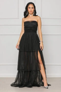 Stand out at any event in this strapless tulle gown. This elegant dress features a sweetheart neckline, tiered tulle detailing, and a half-length double lining while the side split adds a touch of charm. Featuring an easy-to-wear side zipper closure, this gown will look great with statement accessories and heels for a glamorous look that’s sure to leave everyone wanting more!