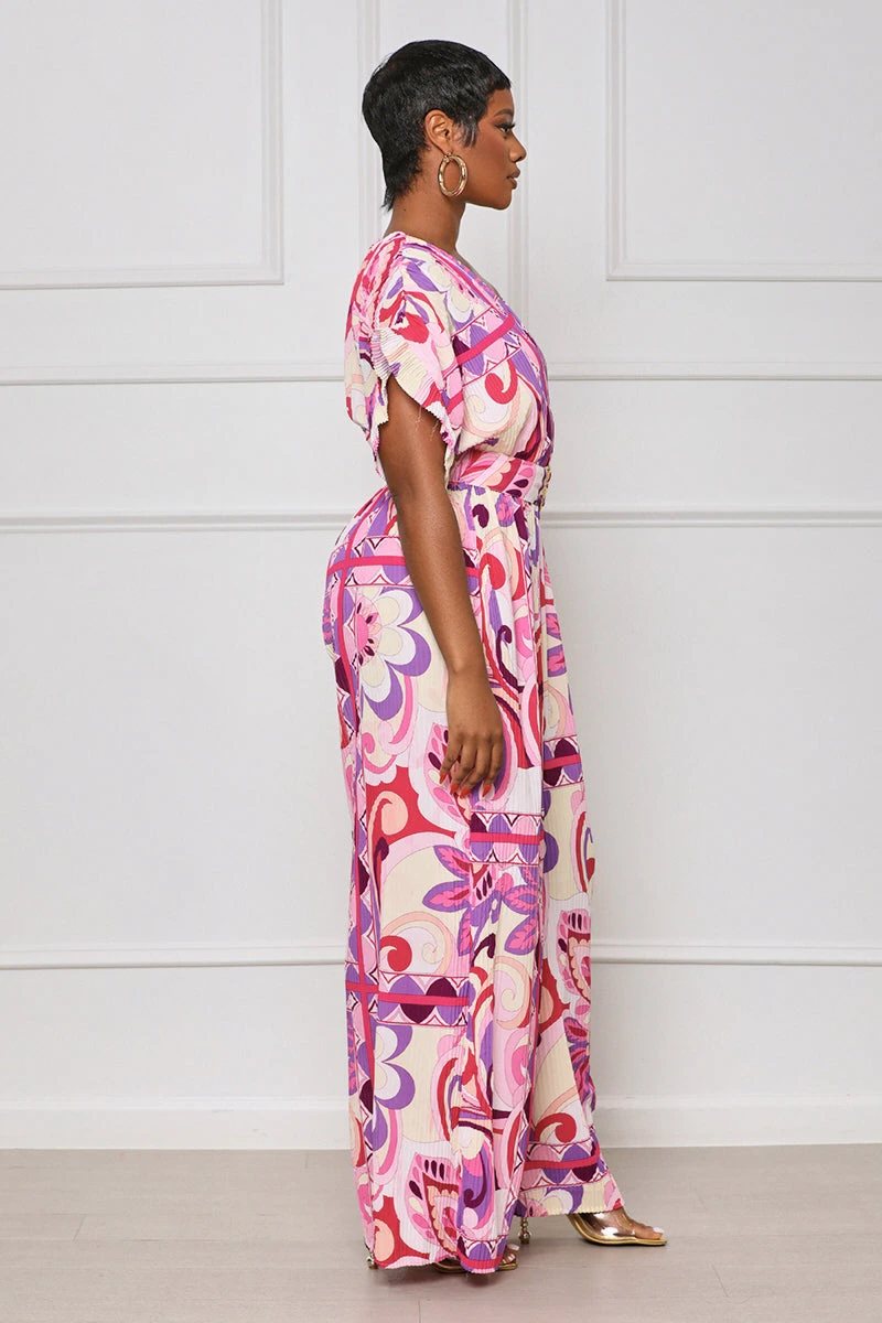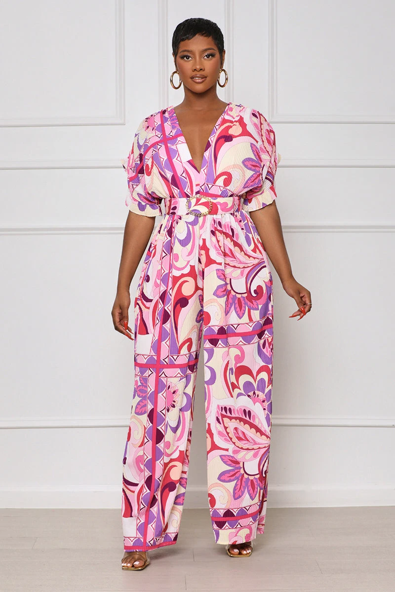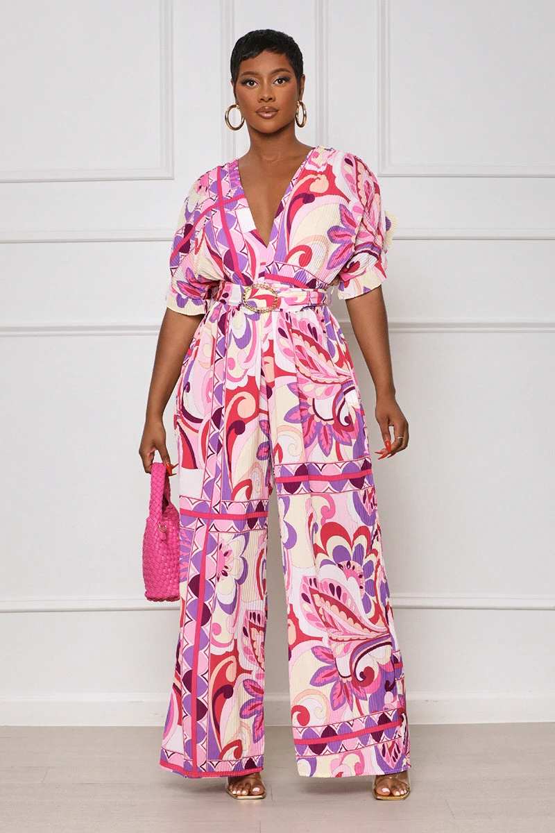 Our Summer Blooming Plisse Jumpsuit is a delicate masterpiece crafted with a luxurious plisse material and punctuated with an elegant plunge neckline. Featuring an eye-catching jeweled circle detailing on the removable waist belt, this statement piece is perfect for any occasion. Finishing with a sleek back zipper closure, the jumpsuit is the epitome of sophisticated elegance. Style with classic heels and a purse for your next getaway.
