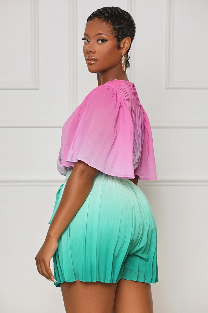 Treat yourself to the perfect getaway look with our Summer Days Ombre Romper. From its flattering plunge neckline to its pleated design and vibrant ombre print, this piece ensures sophistication and exclusivity, making it ideal for any special occasion or your next vacation. Complemented by a removable waist belt, this romper is best paired with a pair of heels and a bag. Enjoy summer moments with style and grace.