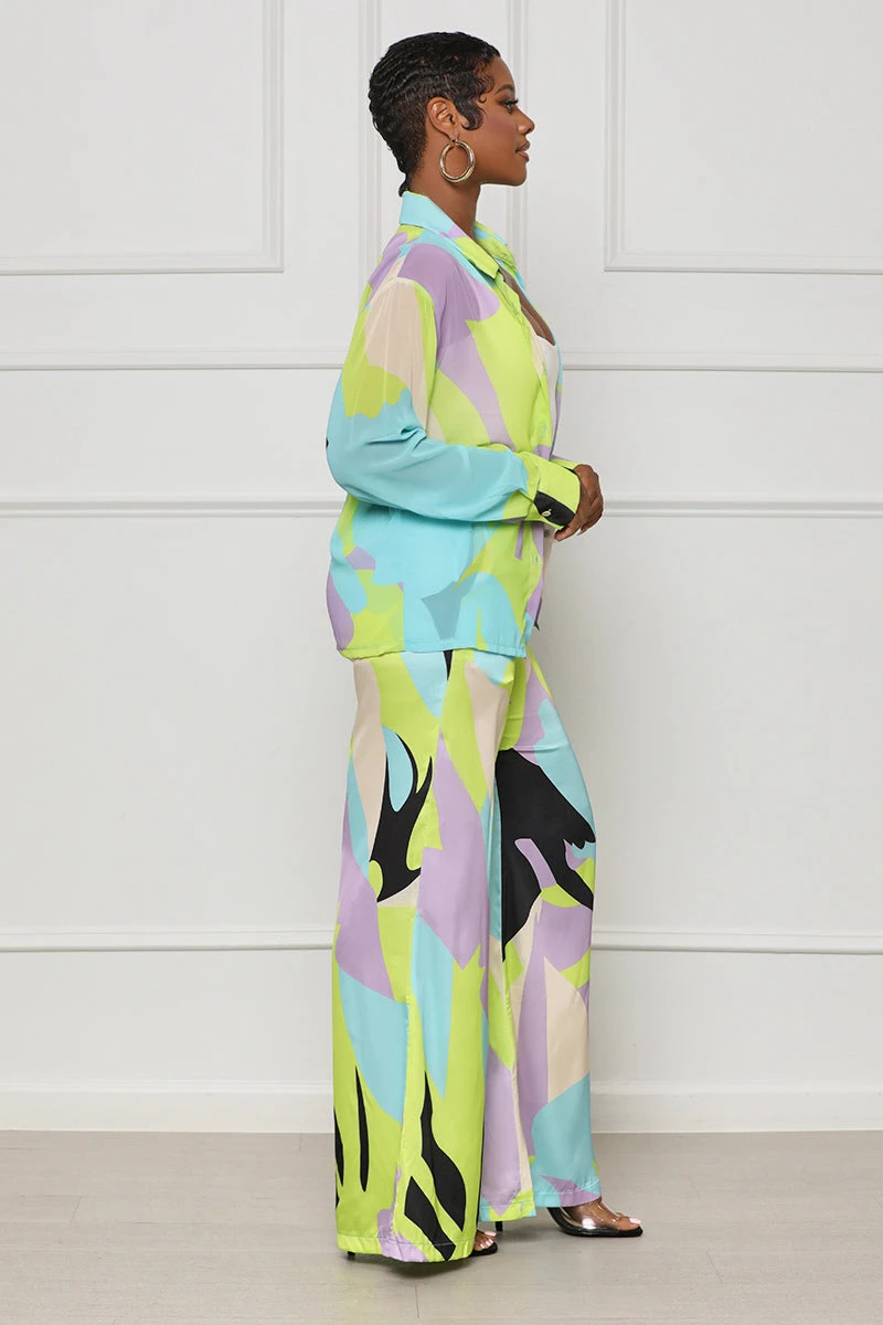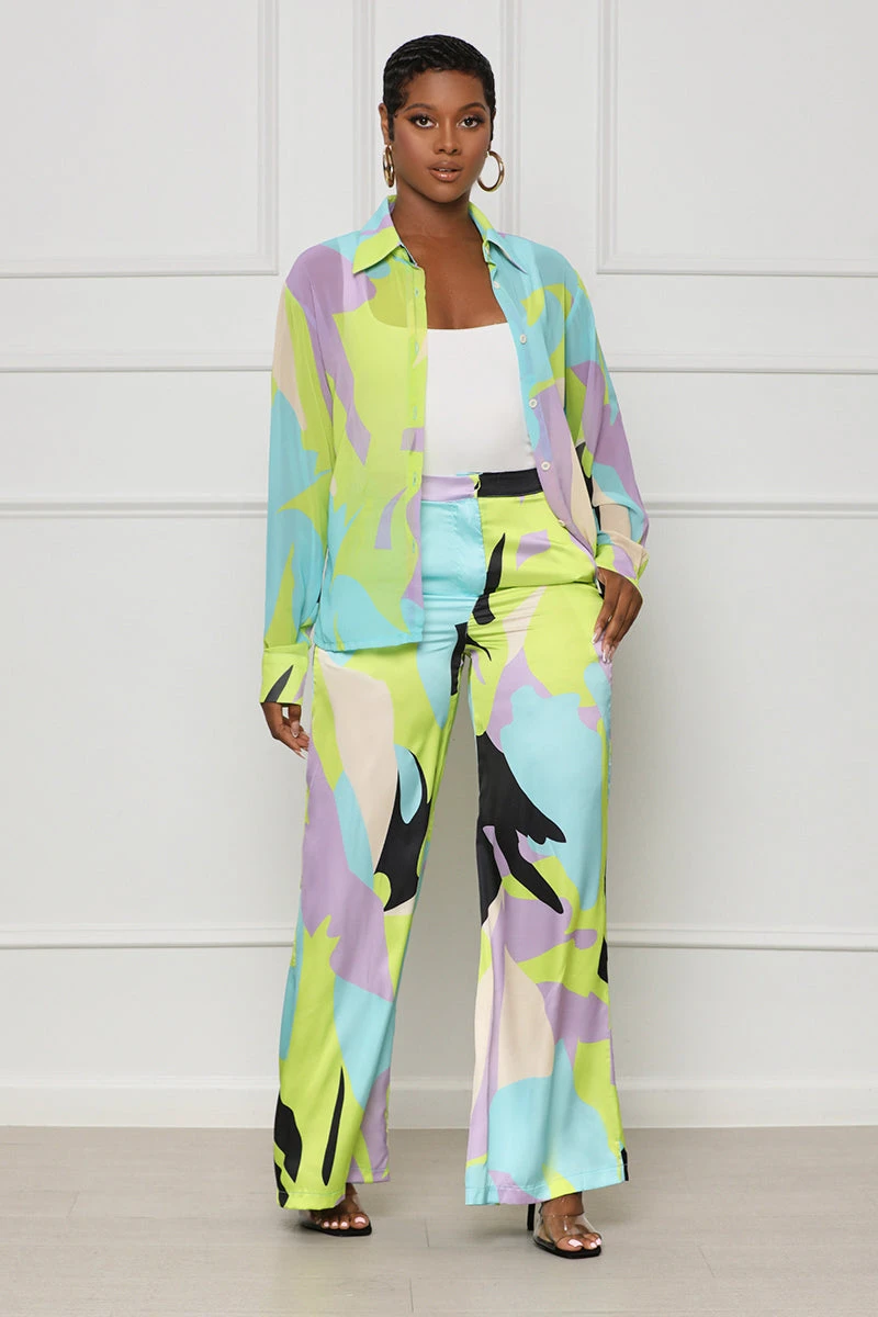 Our Summer Meadows Button Up Pants Set is the perfect addition to your warm-weather wardrobe. Crafted from the highest quality materials, this set offers a sheer button-up top with matching pants, as well as two side pockets and a clasp closure. Style it with a pair of heels and a clutch for a brunch look or a quick lunch date. Take your style to the next level with the perfect mix of elegance and charm.