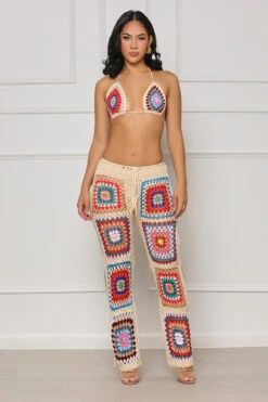 Stay fashionable and stylish during the summer with the Summer’s Here Crochet Pants Set. This two-piece set includes a matching bikini top and cropped pants with a drawstring waistband, giving you the perfect look for a beach day.