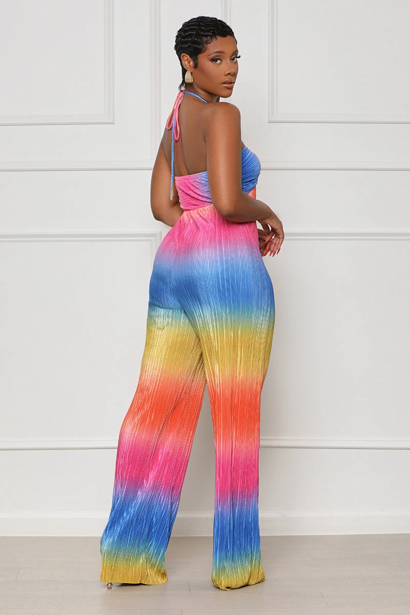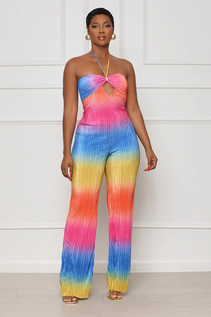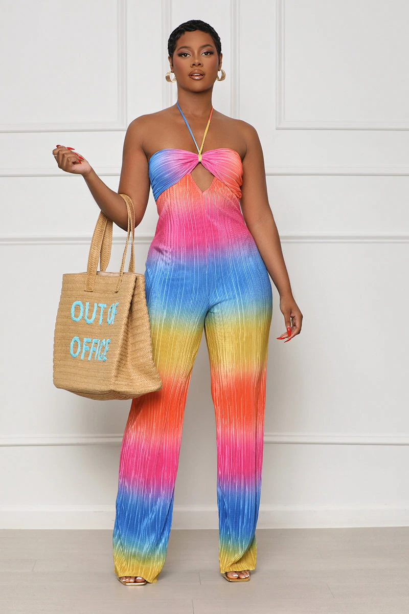Our Summer Sun Halter Top Jumpsuit is a must have for your next tropical adventure. Designed with unique ombre print, maximum stretch, and a halter-top design for optimal comfort and movement. The peep hole cut out in the center adds an extra element of style and fashion to this vacation-ready look, so grab your shades and straw bag and get ready to make some summer memories.