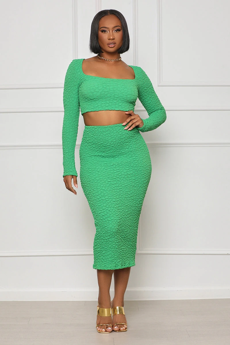 The Summer Thrillz Pencil Skirt Set is the perfect piece for your next vacation. The crop top features long sleeves, a square neckline, and a textured material. The matching skirt has a flattering fit and maximum stretch. Style this set with a statement clutch and your favorite heels for drinks on vacation!