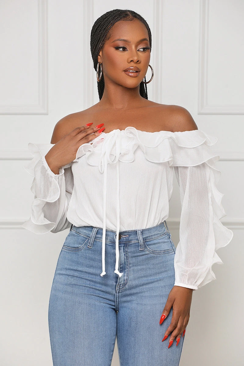 Discover timeless romance with the Super Selective Ruffle Off Shoulder Bodysuit. Adorned with intricate ruffles that cascade gracefully down the sleeves, this off-shoulder bodysuit will add a sophisticated and elegant touch to any summer ensemble. Style with jeans or shorts for a relaxed fit. Whether you’re brunching with friends or having a picnic in the park, this piece will create a romantic feel in your wardrobe.